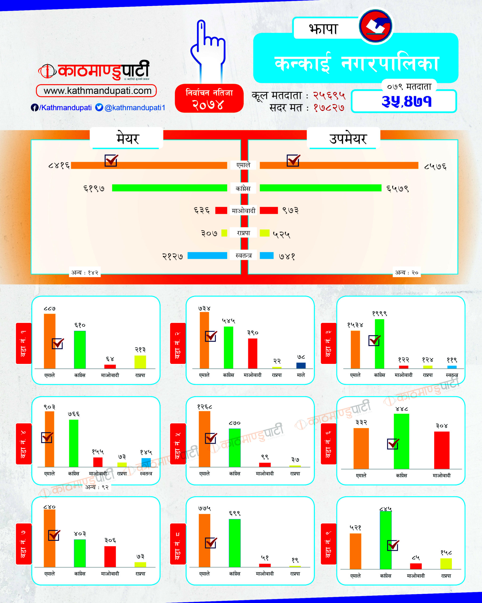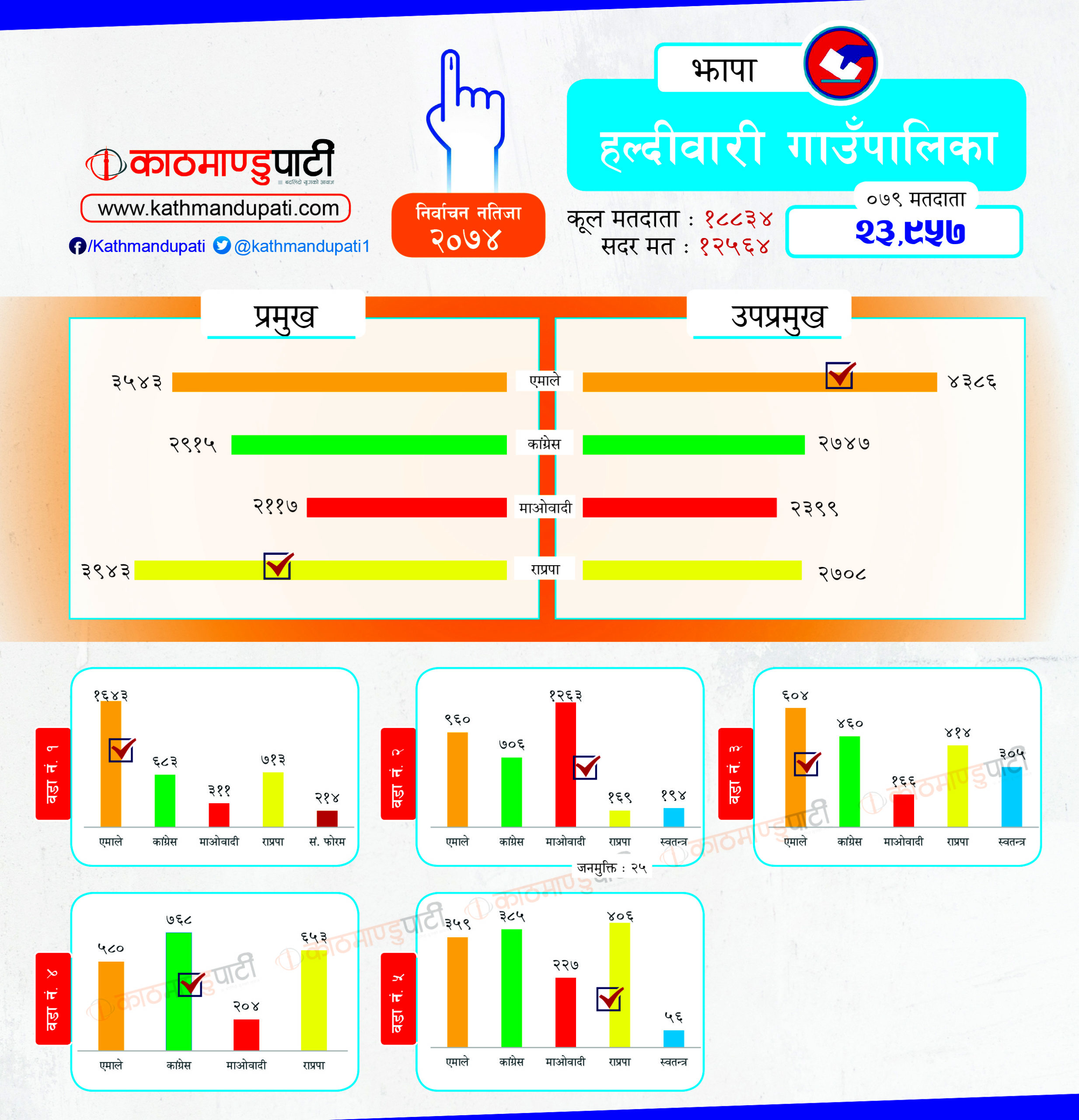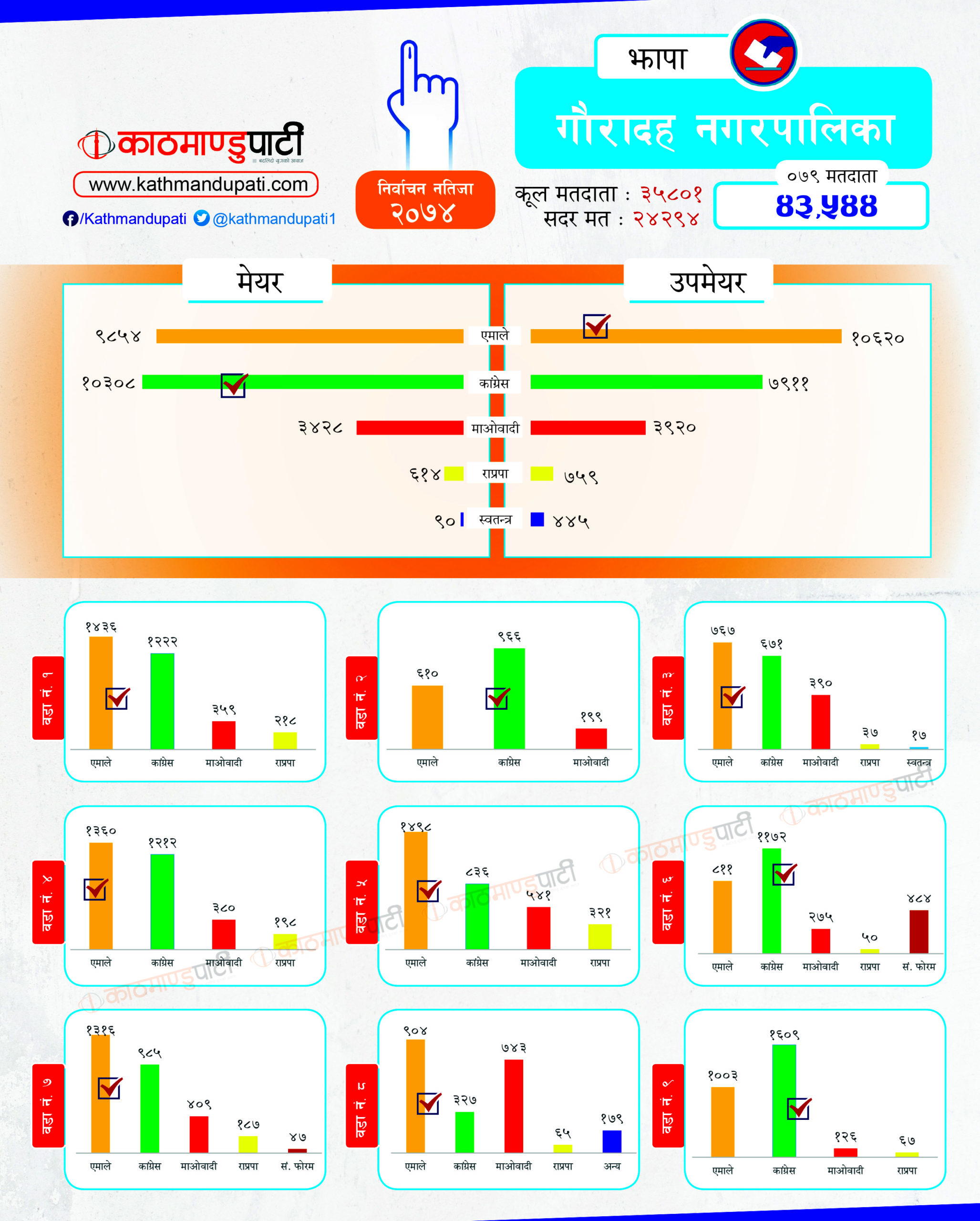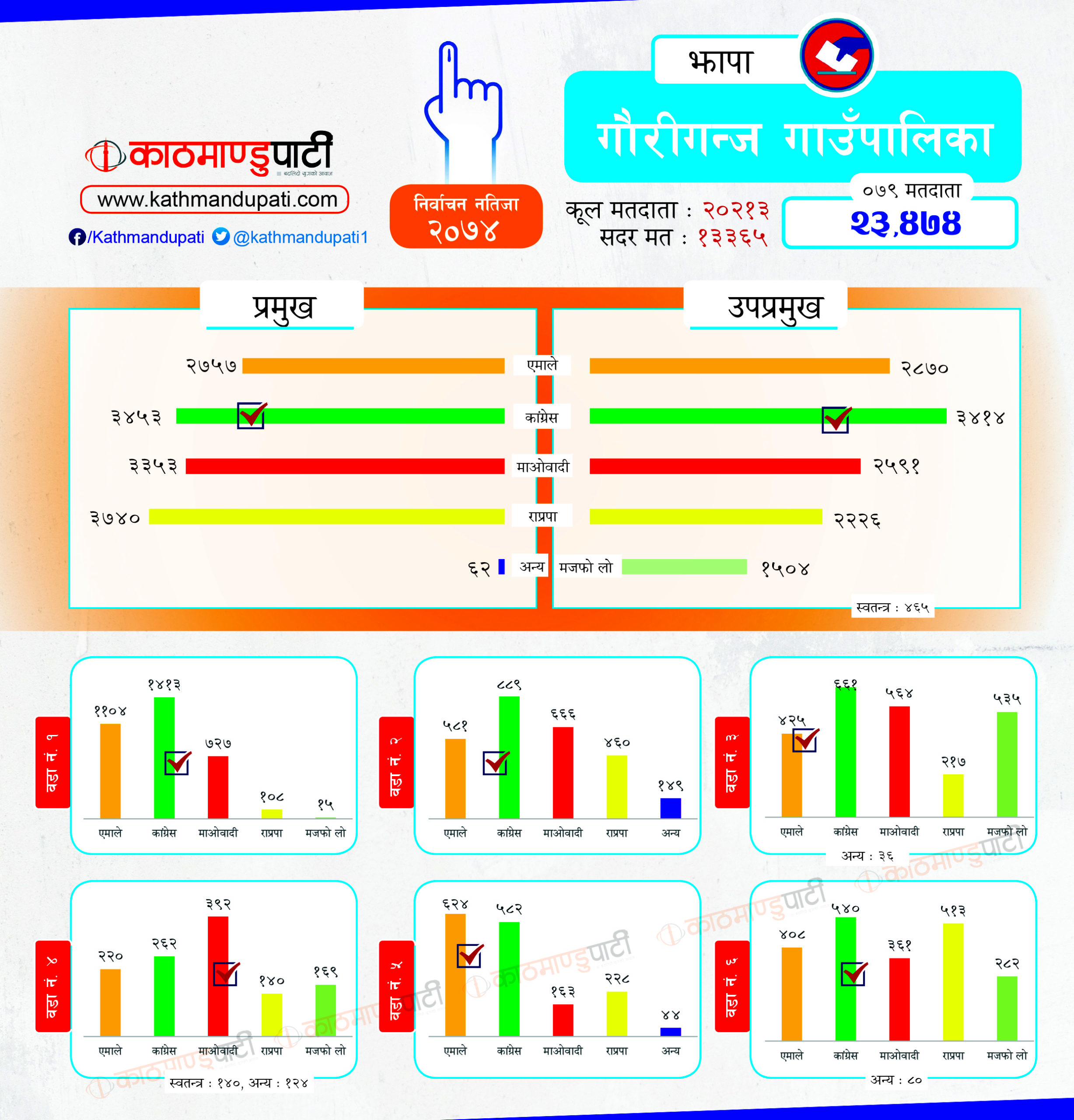 कांग्रेसले गौरादह नगरपालिका, झापा गाउँपालिका, बाह्रदशी गाउँपालिका, बुद्धशान्ति गाउँपालिका र मेचीनगर नगरपालिका जितेको थियो भने कचनकवल गाउँपालिका, गौरीगन्ज गाउँपालिका र हल्दीबारी गाउँपालिका राप्रपाले जितेको थियो । चौथो शक्ति माओवादीले कुनै पालिका जित्न सकेन ।