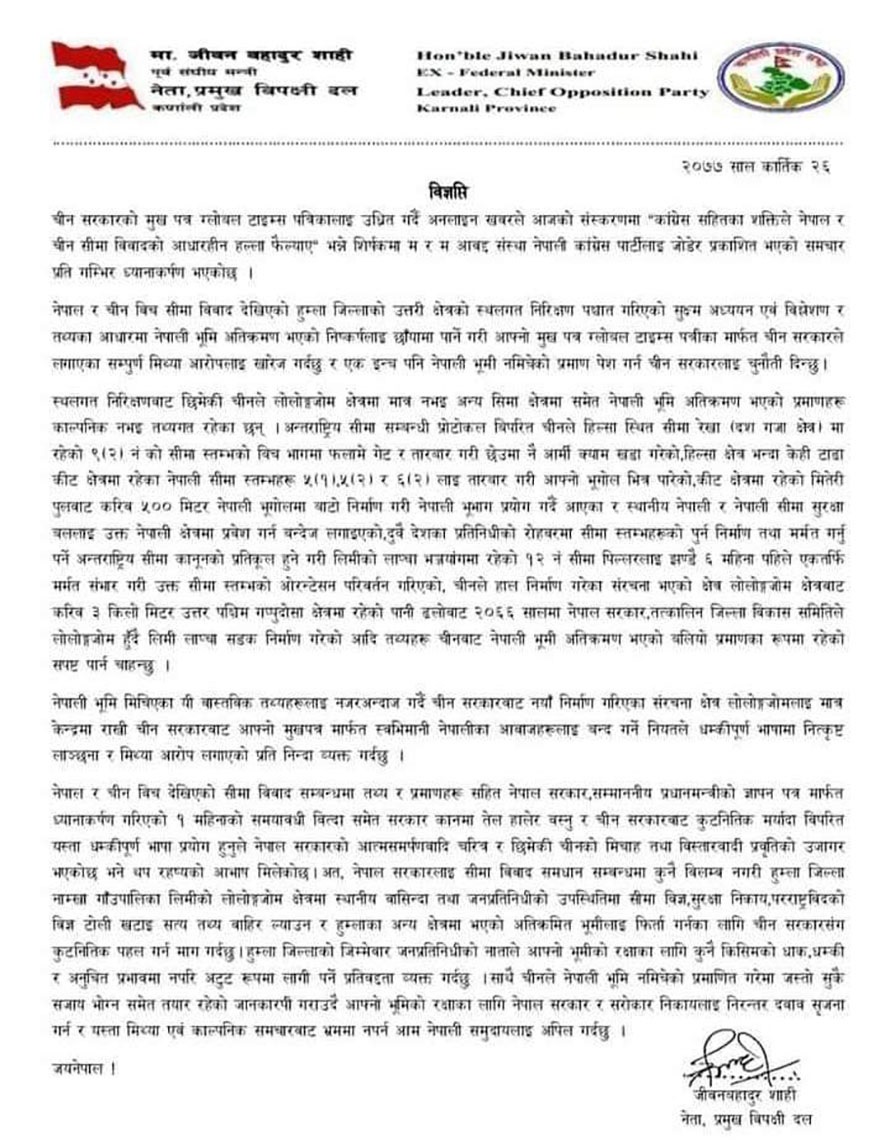 एक विज्ञप्ति जारी गर्दै नेता शाहीलाई चीन सरकारले लगाएका उक्त आरोप मिथ्या भएको भन्दै एक इन्च पनि नेपाली भूमी नमिचेको प्रमाण पेश गर्न चुनौती दिएका छन् ।