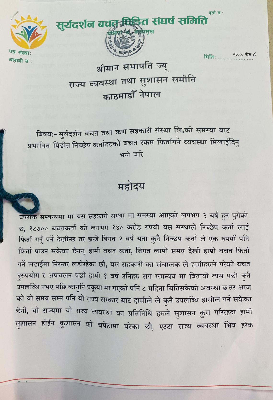 काठमाण्डु- संसद्को राज्य व्यवस्था तथा सुशासन समितिमा पोखराको सूर्यदर्शन सहकारी संस्थाका पीडित बचतकर्ताहरूले उजुरी दिएका छन्।