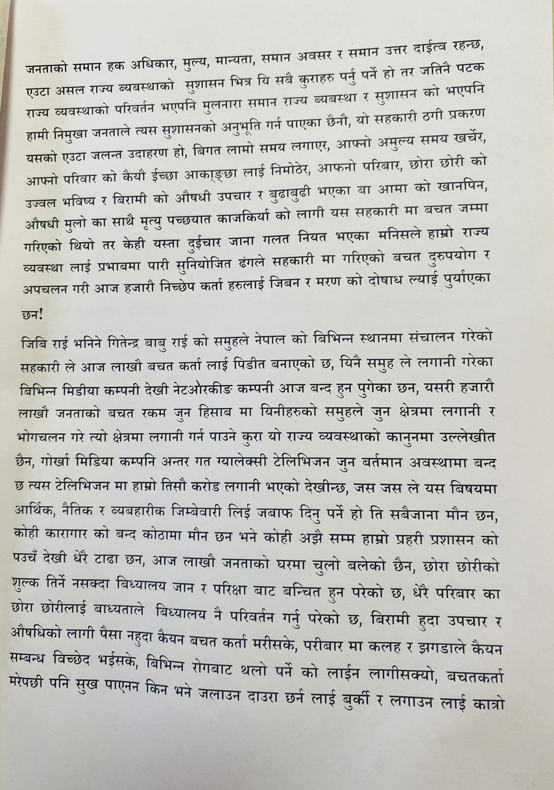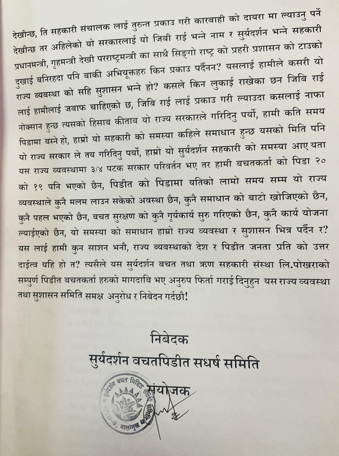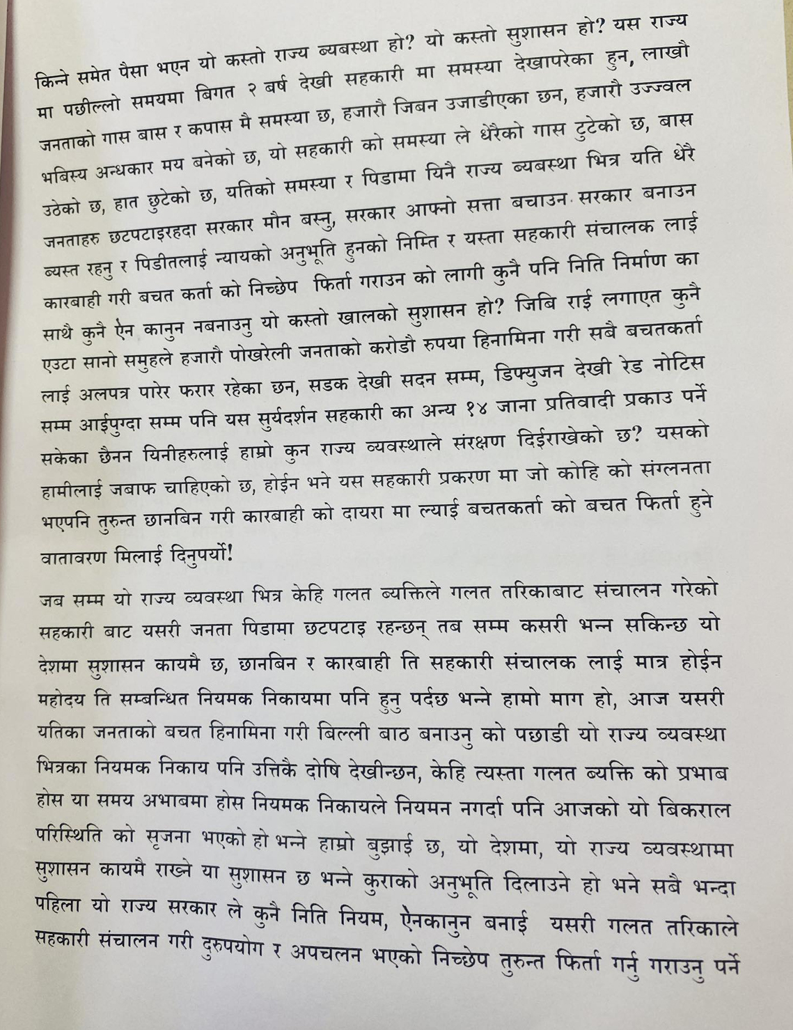 ‘सडकदेखि सदनसम्म, डिफ्युजनदेखि रेड नोटिससम्म आइपुग्दा पनि यस सूर्यदर्शन सहकारीका अन्य १४ जना प्रतिवादी पक्राउ पर्न सकेका छैनन्। यिनीहरूलाई हाम्रो कुन राज्य व्यवस्थाले संरक्षण दिइराखेको छ?’, मागपत्रमा भनिएको छ ।