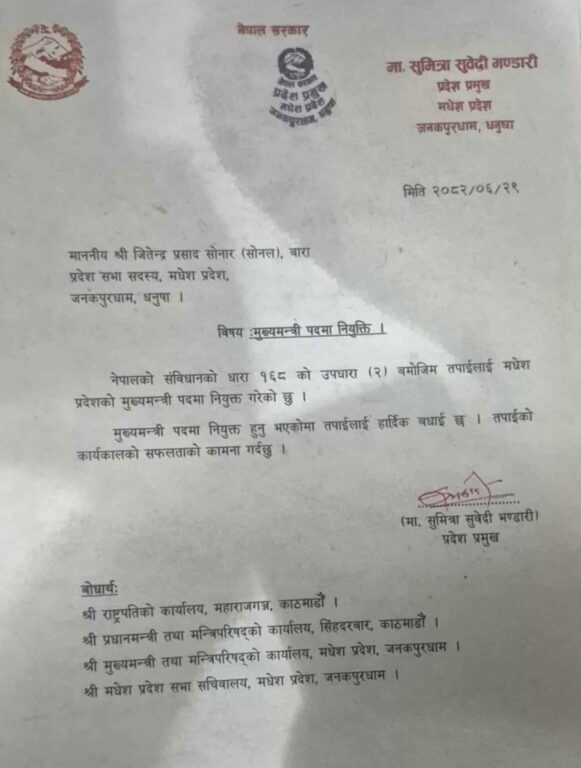 जनकपुरधाम – मधेश प्रदेशको नयाँ मुख्यमन्त्रीमा लोकतान्त्रिक समाजवादी पार्टी (लोसपा) नेता जितेन्द्र सोनल नियुक्त भएका छन् ।