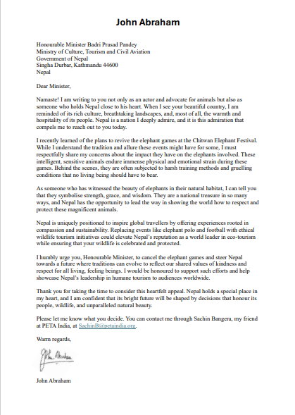 ‘यी बुद्धिमान र संवेदनशील जनावरले खेलका क्रममा शारीरिक र भावनात्मक पीडा भोग्नुपर्छ’, अब्राहमले लेखेका छन्, ‘जसले प्राकृतिक वासस्थानमा हात्तीहरूको सुन्दरता देखेका छन्, ती सबैलाई थाहा छ–हात्ती शक्ति र बुद्धिको प्रतीक मात्र नभई राष्ट्रिय सम्पदासमेत हुन् ।’