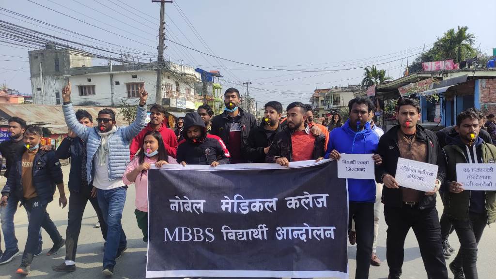 विद्यार्थीका माग पुरा गर्नेतर्फ उदासिनता देखिएको भन्दै सोमबार विद्यार्थीहरुले नोबेल प्रशासन बिरुद्ध सिट्टि जुलुस सहित प्रदर्शन गरेको थियो । उक्त शान्तिपूर्ण प्रदर्शनमा कलेज प्रशासनले हस्तक्षेप गर्दा बिद्यार्थी नेताहरु ताजिम अन्सारी, दिपेन्द्र मेहता टेकेन क्षेत्रि ,उमेश सेन्चुरी, सोयब अन्सारी, शहिल झा लगायत १ दर्जन बढी बिद्यार्थी घइते भएका छन् । शान्तिपुर्ण कार्यक्रममा दमन गरेकोप्रति आक्रोसित विद्यार्थी संगठनले इंटको जवाफ पत्थरले दिने भन्दै समस्या समाधानमा पहल नगरे थप कडा संघर्षमा उत्रने चेतावनी दिएको छ ।