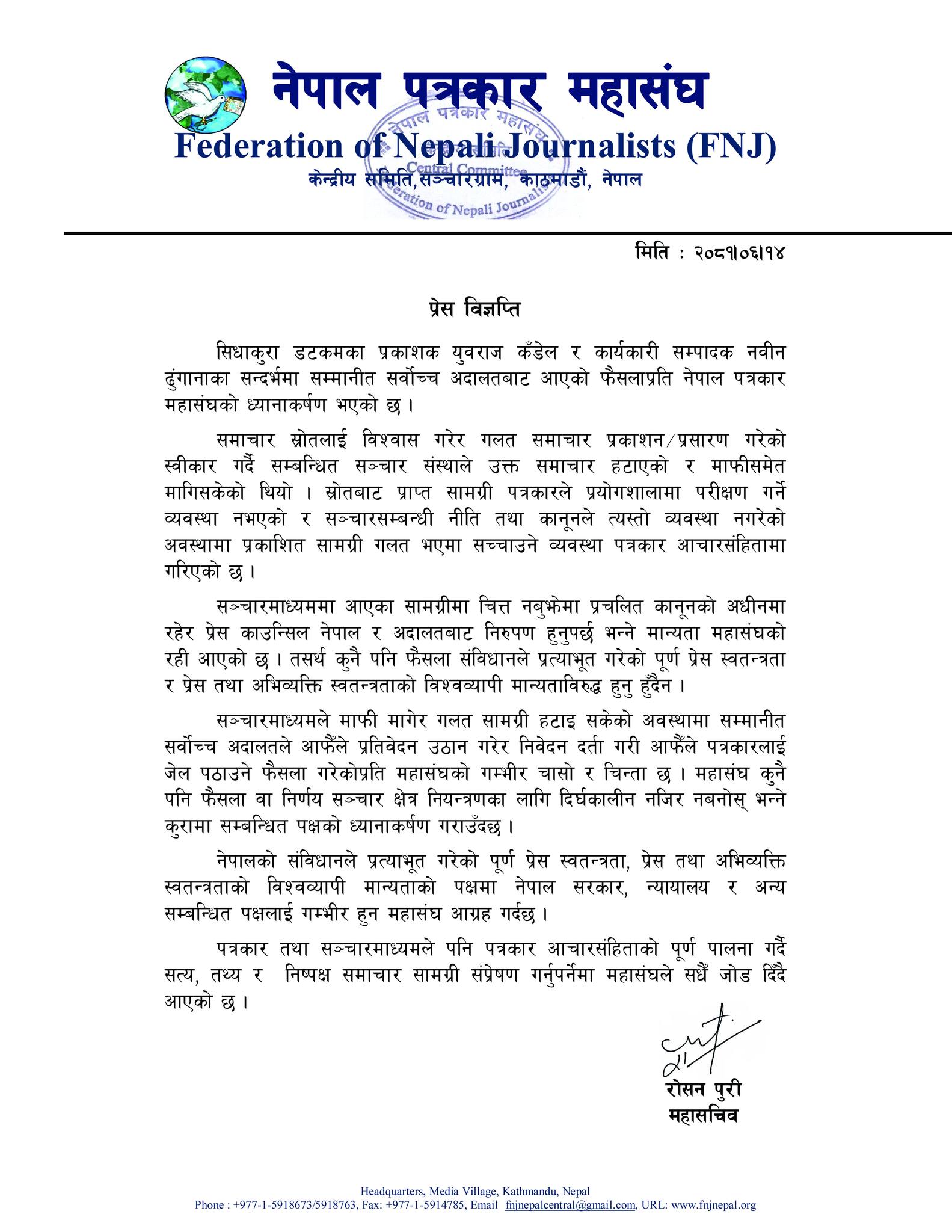 सञ्चारमाध्यममा आएका सामग्रीमा चित्त नबुझेमा प्रचलित कानूनको अधीनमा रहेर प्रेस काउन्सिल नेपाल र अदालतबाट निरुपण हुनुपर्छ भन्ने मान्यता महासंघ रहेको विज्ञप्तिमा महासचिव पुरीले उल्लेख गरेका छन् । महासंघले मुलुकको सर्वोच्च न्यायालयबाट हुने कुनै पनि फैसला संविधानले प्रत्याभूत गरेको पूर्ण प्रेस स्वतन्त्रता र प्रेस तथा अभिव्यक्ति स्वतन्त्रताको विश्वव्यापी मान्यताविरुद्ध हुनु नहुँने महासंघले बताएको छ ।