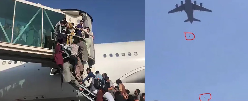 अन्तराष्ट्रिय सञ्चार माध्यमहरुका अनुसार सैन्य विमानको टायरको बीचमा देश छोड्नको लागी उभिएका थिए । काबुल बिमानस्थलबाट उडेको पछि, जसरी नै विमान हावामा पुग्यो । यी मानिसहरु एक एक गरी तल झर्न थाले । शहरका मानिसहरूले उनीहरुलाई खसेको देखेका थिए । तर, उनीहरुको पहिचान हुन सकेको छैन ।