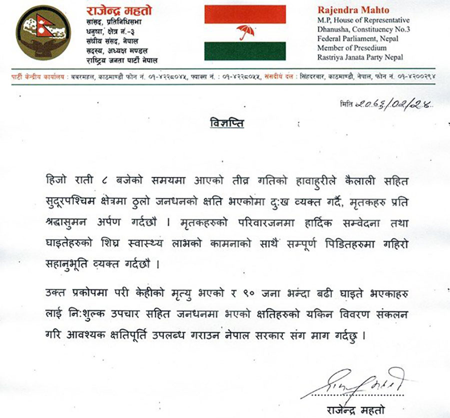 राजपा नेता राजेन्द्र महतोद्धारा जारी विज्ञप्तीमा हावाहुरीका क्रममा ज्यान गुमाउनेहरुप्रति श्रद्धासुमन समेत अर्पण गरिएको छ ।