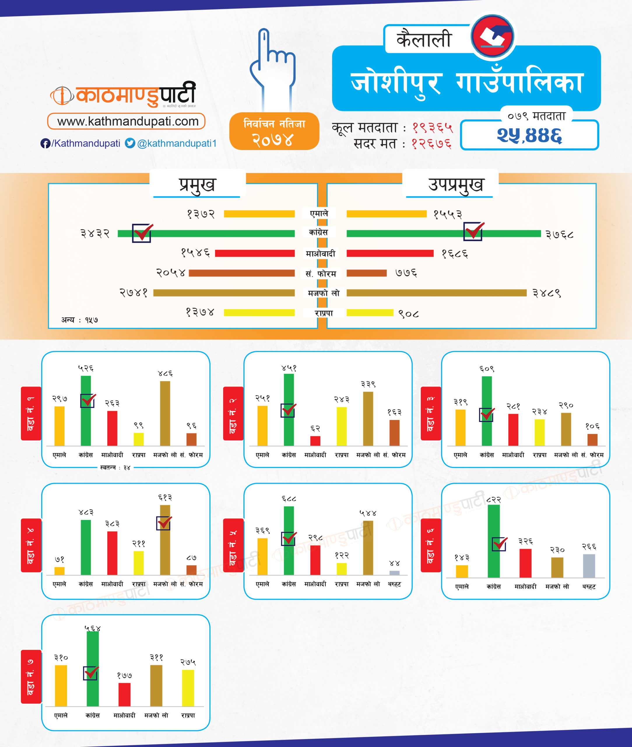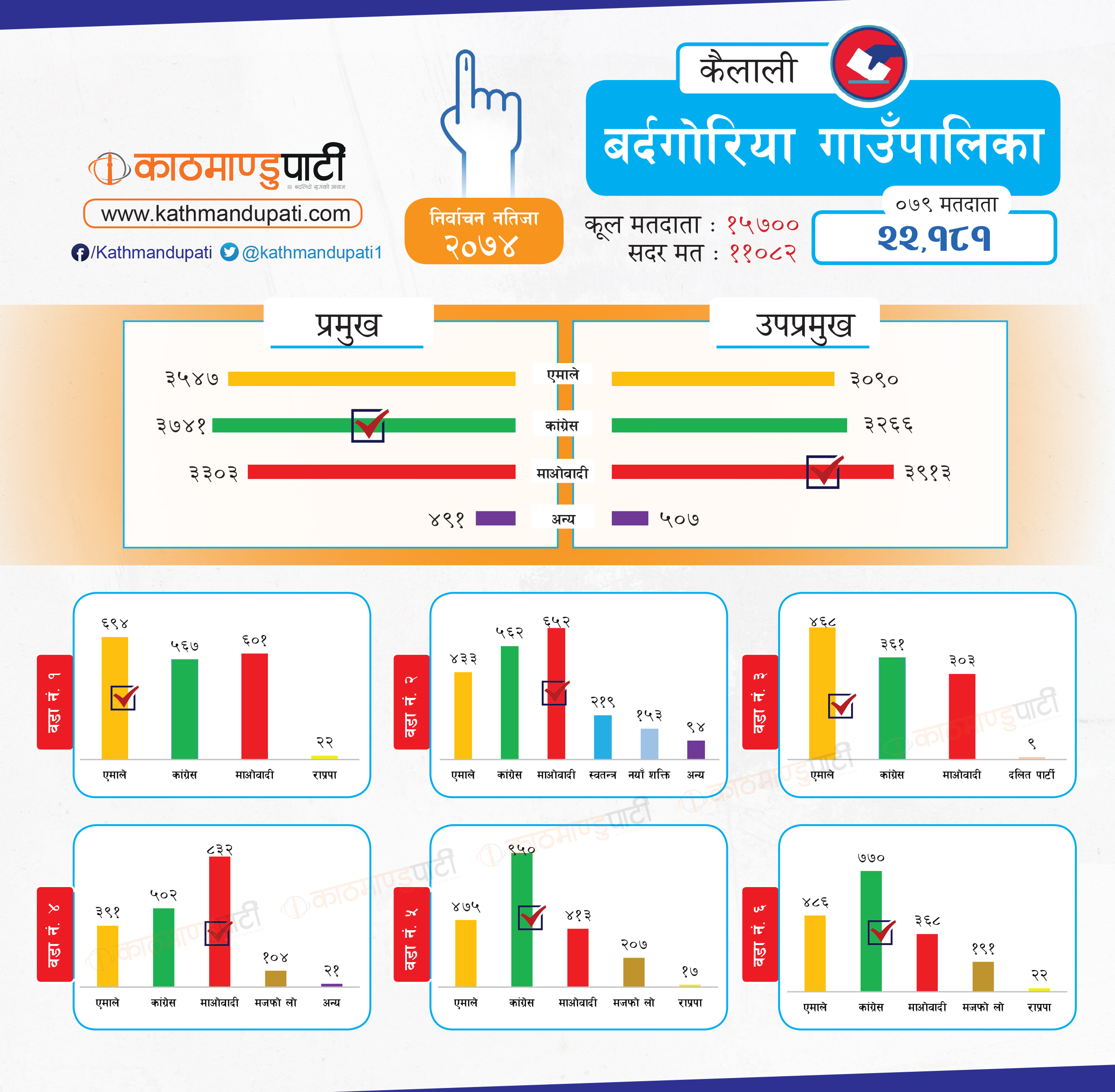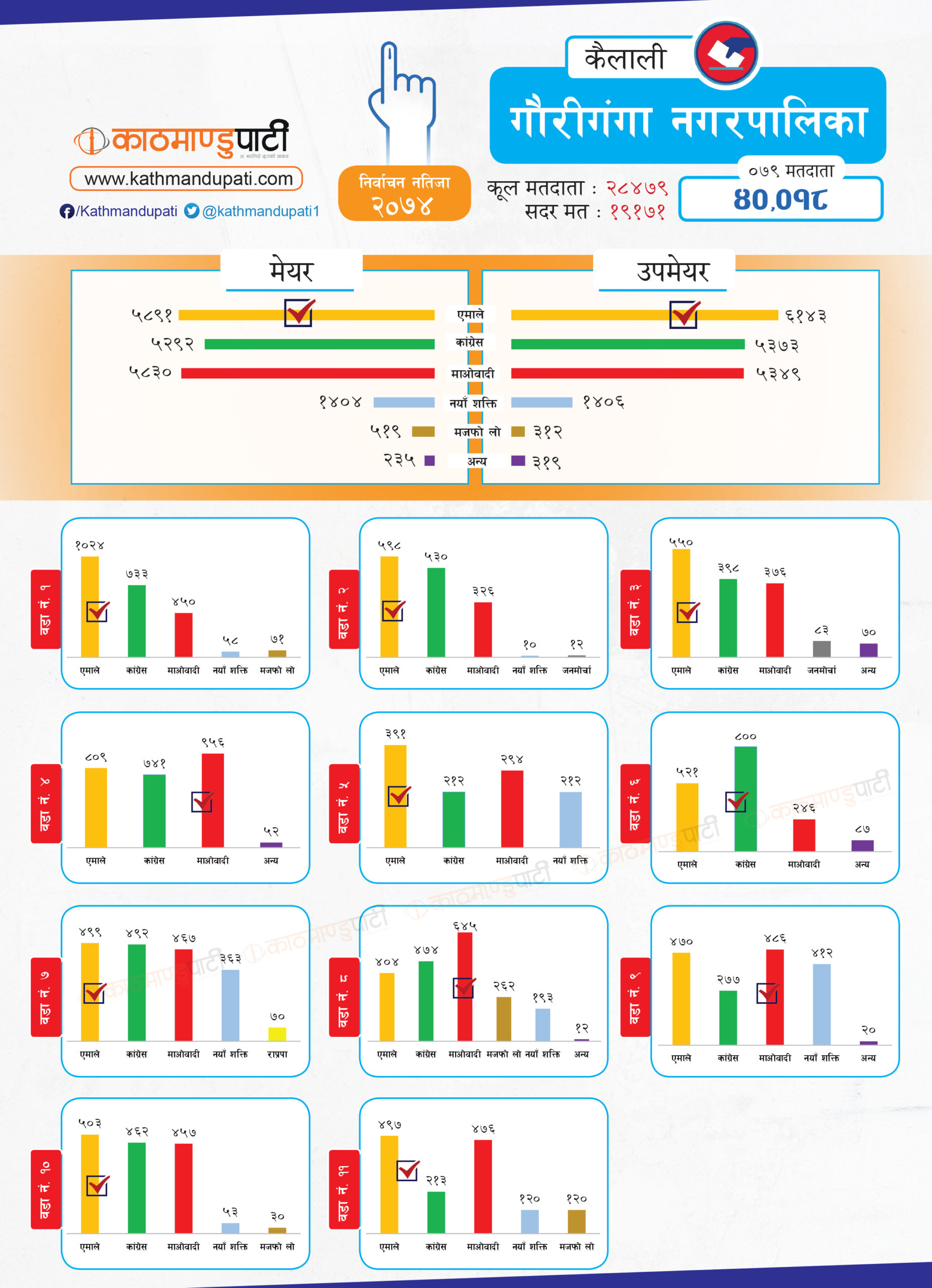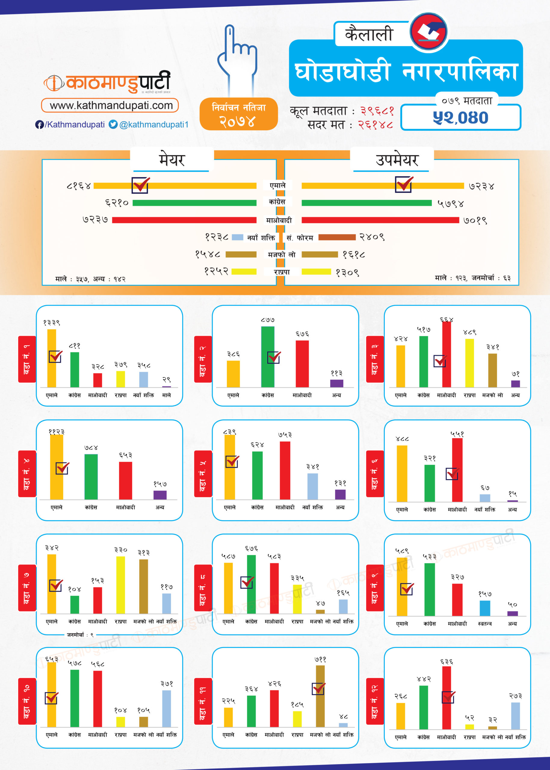 कांग्रेसले घनगढी उपमहानगरबाहेक जोशीपुर गाउँपालिका र बर्दगोरिया गाउँपालिका जितेको थियो । धनगढीमा स्वतन्त्र दोस्रो, माओवादी तेस्रो र एमाले चौथो दल हो । तत्कालीन मधेसी जनअधिकार फोरम लोकतान्त्रिक कांग्रेसमा समाहित भएको हुँदा कैलालीमा कांग्रेस बलियो देखिन्छ ।