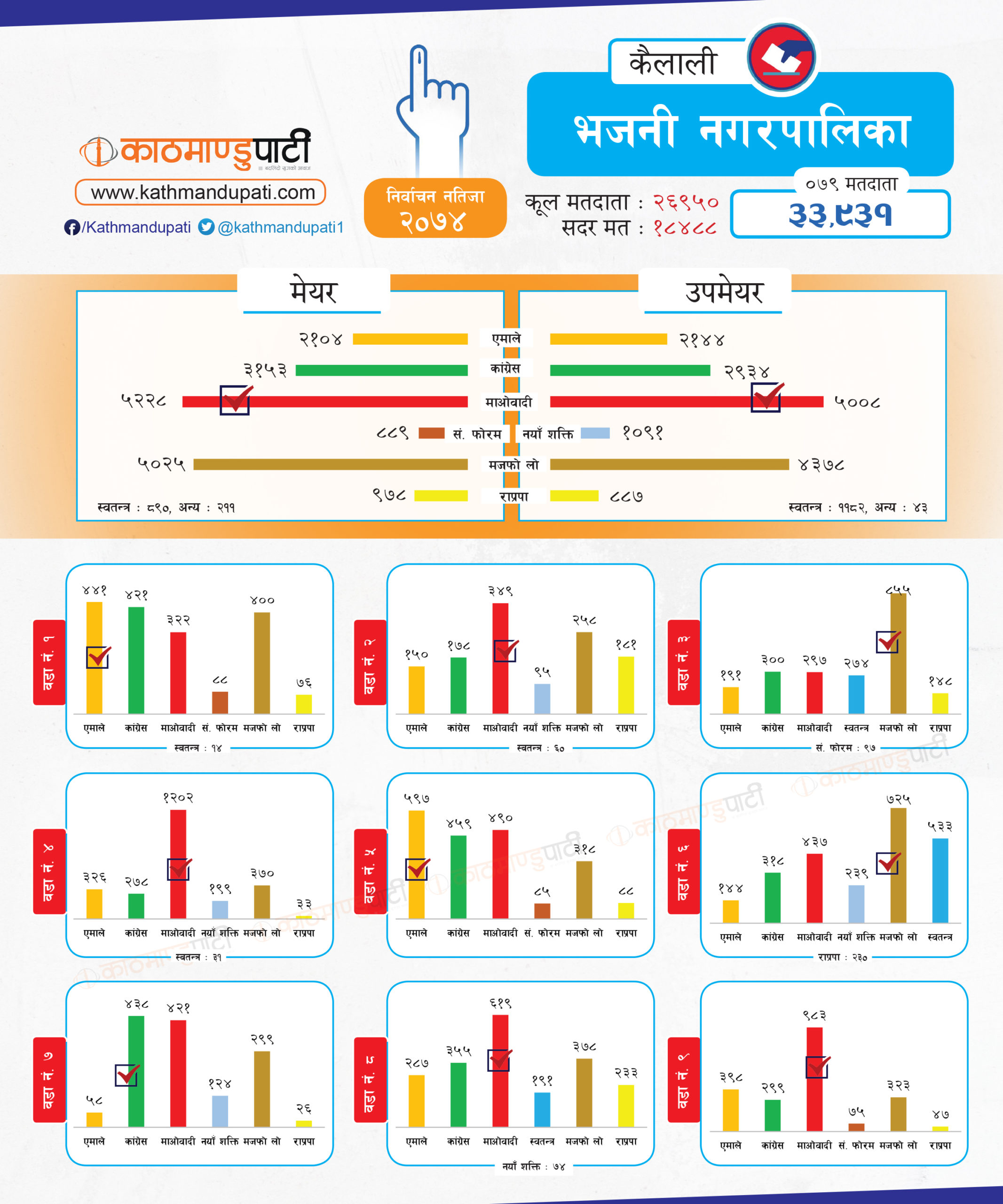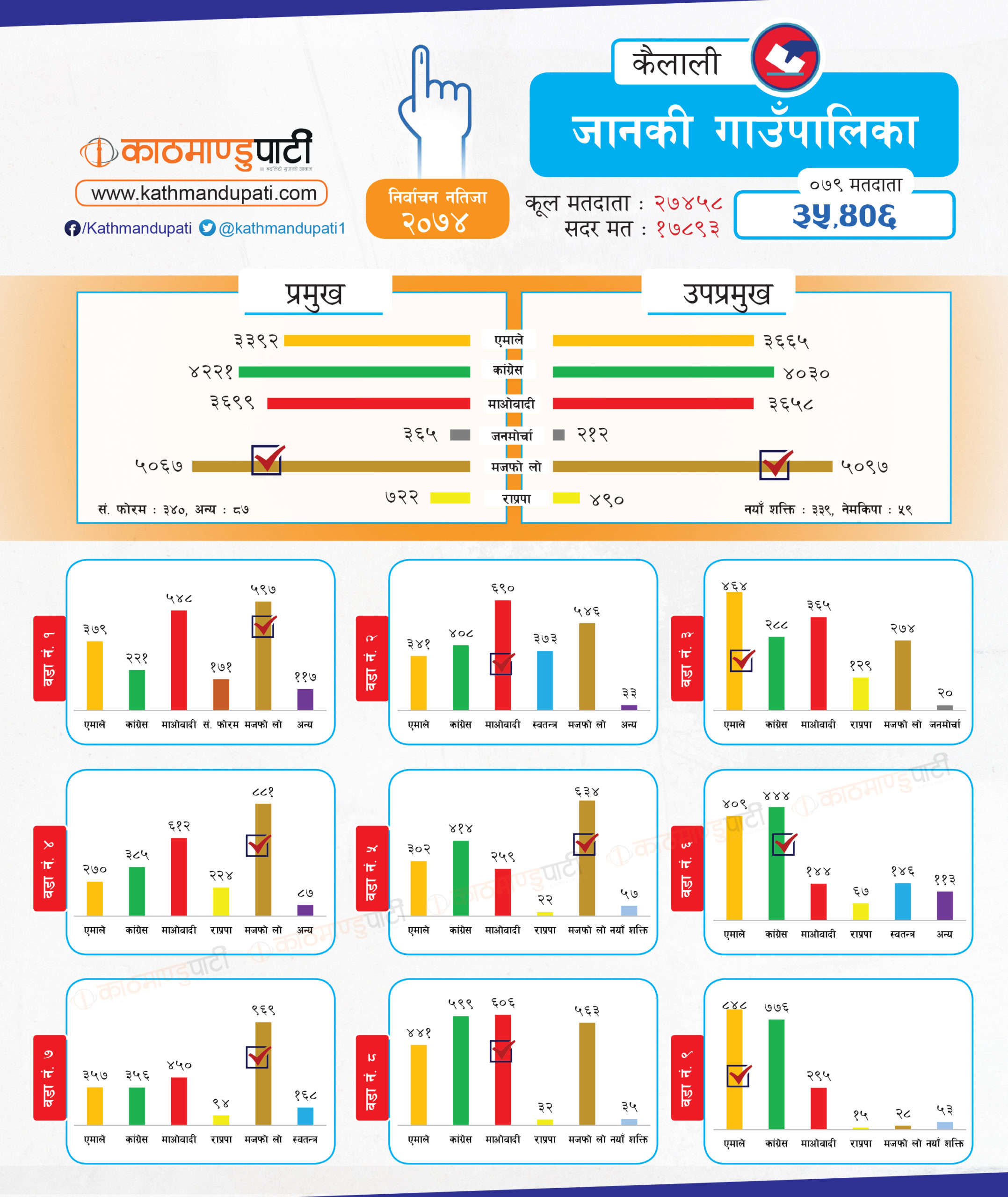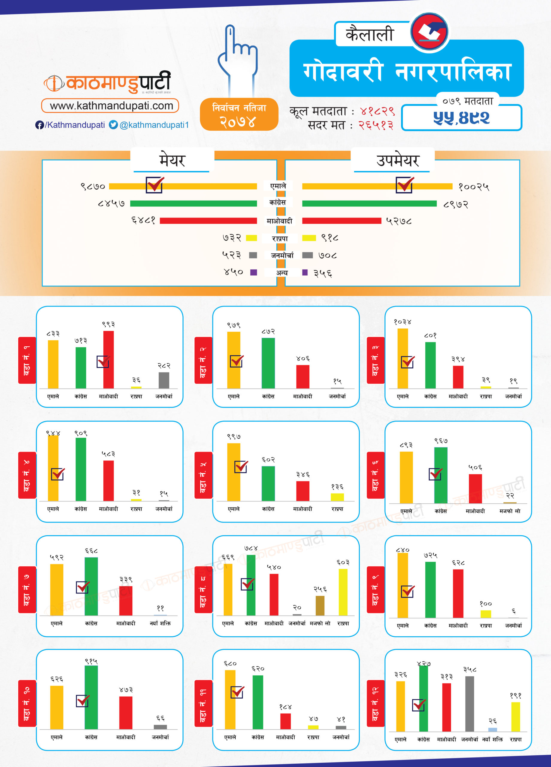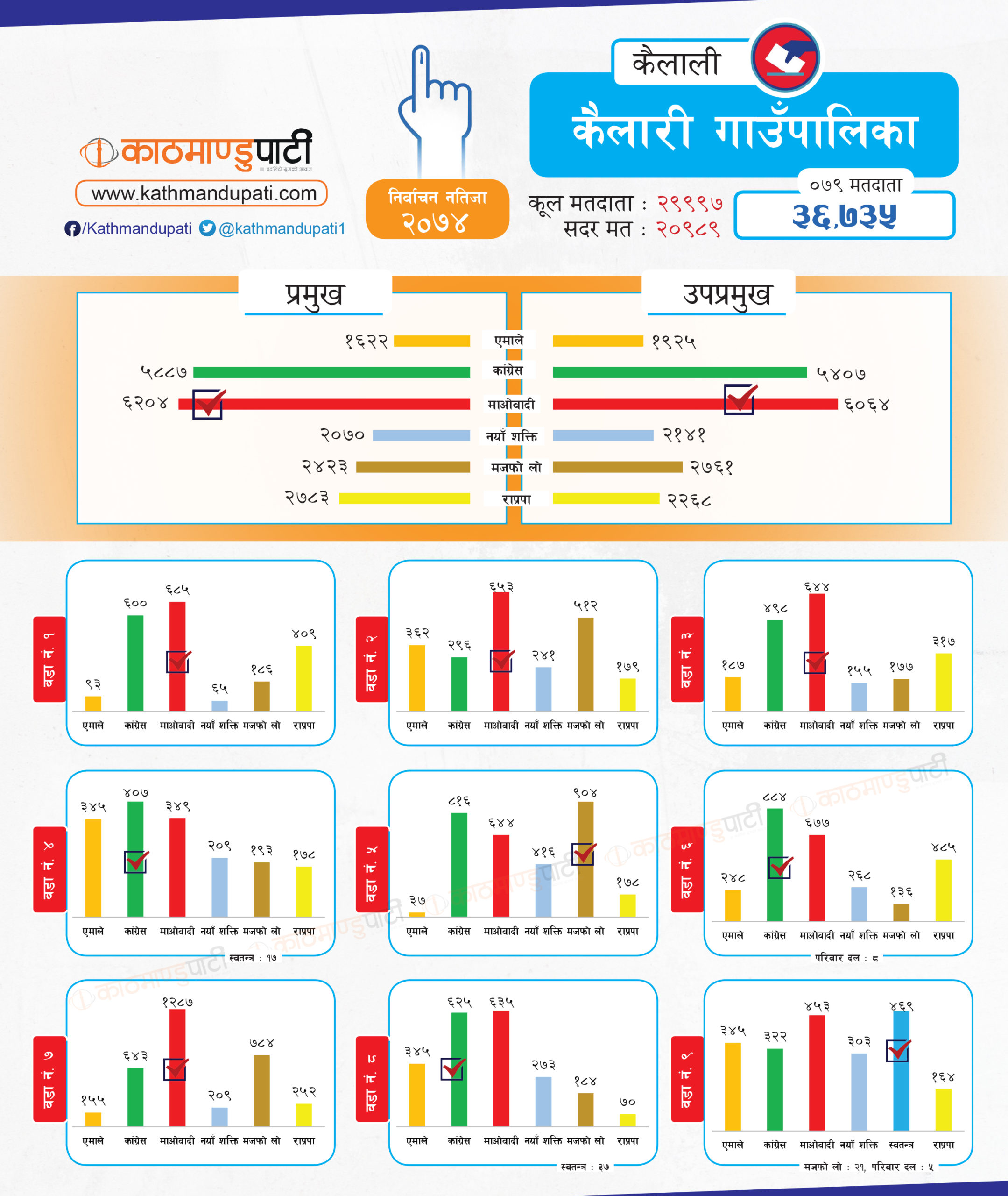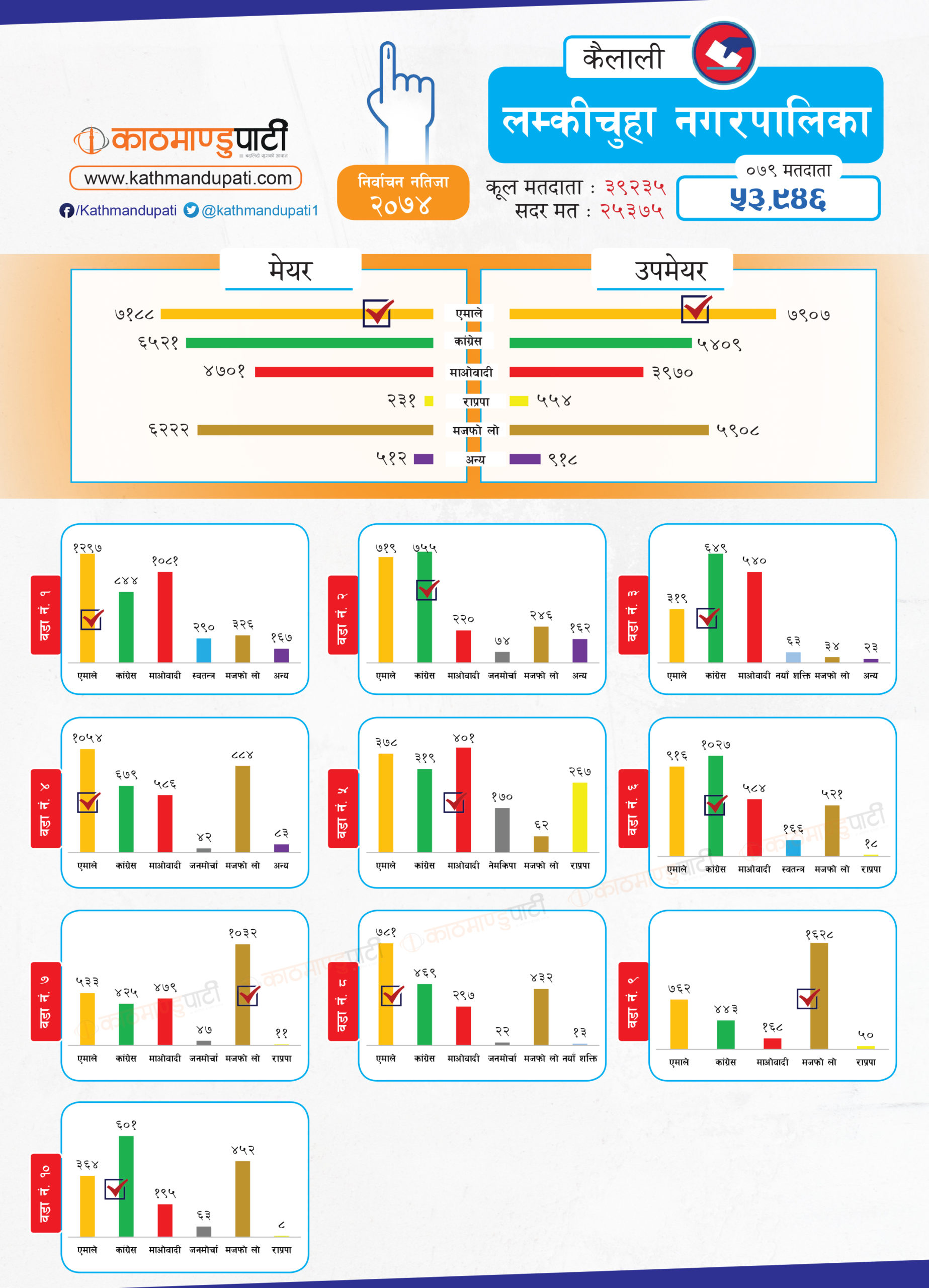 रेशम चौधरीकी पत्नीको नेतृत्वमा गठन गरिएको नागरिक उन्मुक्ति पार्टीले टीकापुर नगरपालिका, भजनी नगरपालिका र जानकी गाउँपालिकाको प्रमुखमा आफ्ना उम्मेदवार उठाउने भएको छ । त्यसकारण पनि कैलालीमा प्रतिस्पर्धा निकै रोचक हुने देखिन्छ । जिल्लामा आगामी निर्वाचनका लागि २ लाख ५६ हजार १ सय ४ पुरुष, २ लाख ६९ हजार १० महिला र अन्य ११ गरी ५ लाख २५ हजार १ सय २५ मतदाता छन् ।