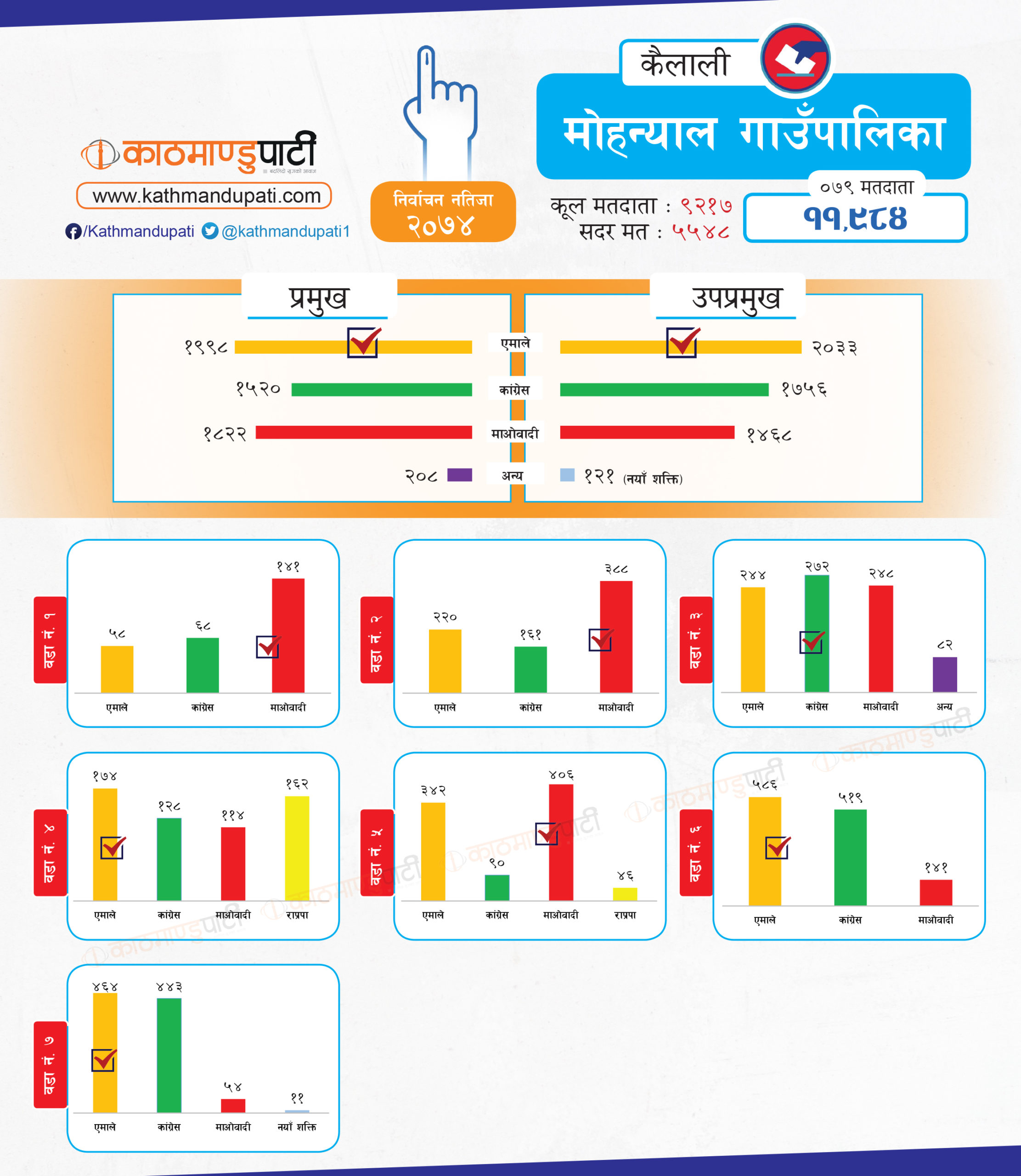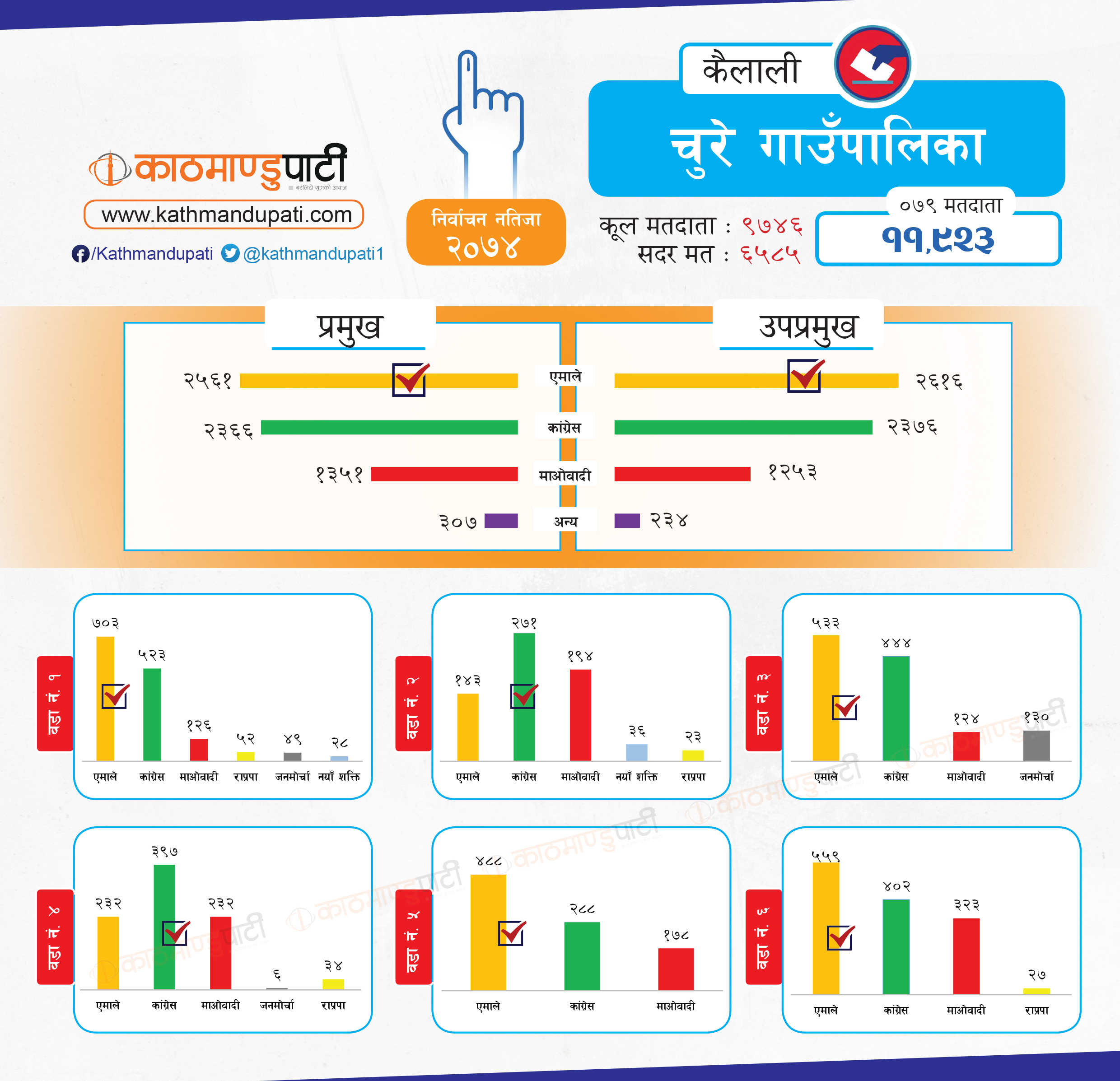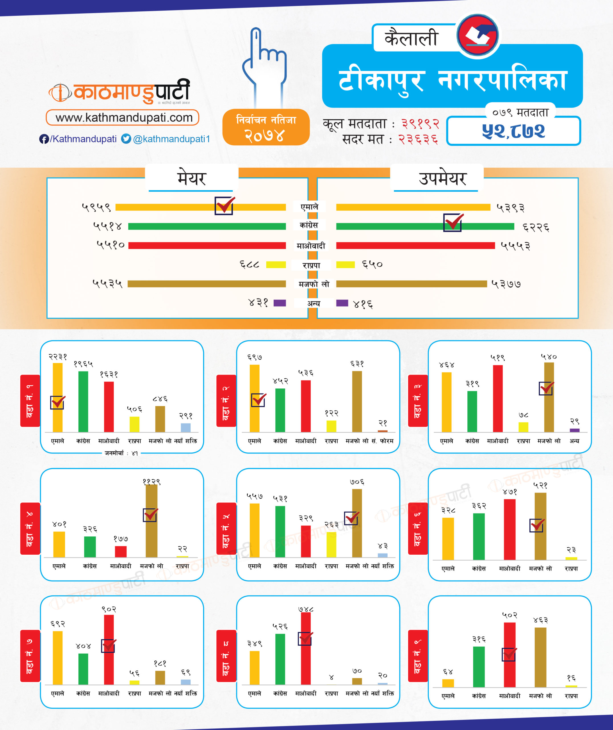 एमालेले नै जितेको टीकापुर नगरपालिकामा तत्कालीन मधेसी जनअधिकार फोरम लोकतान्त्रिक दोस्रो प्रतिस्पर्धी दल थियो भने चार मतान्तरले कांग्रेस तेस्रो दल बनेको थियो । माओवादी चौथो दल बनेको थियो । यसबाहेक एमालेले मोहन्याल गाउँपालिका र चुरे गाउँपालिकाको प्रमुख पनि जितेको थियो ।