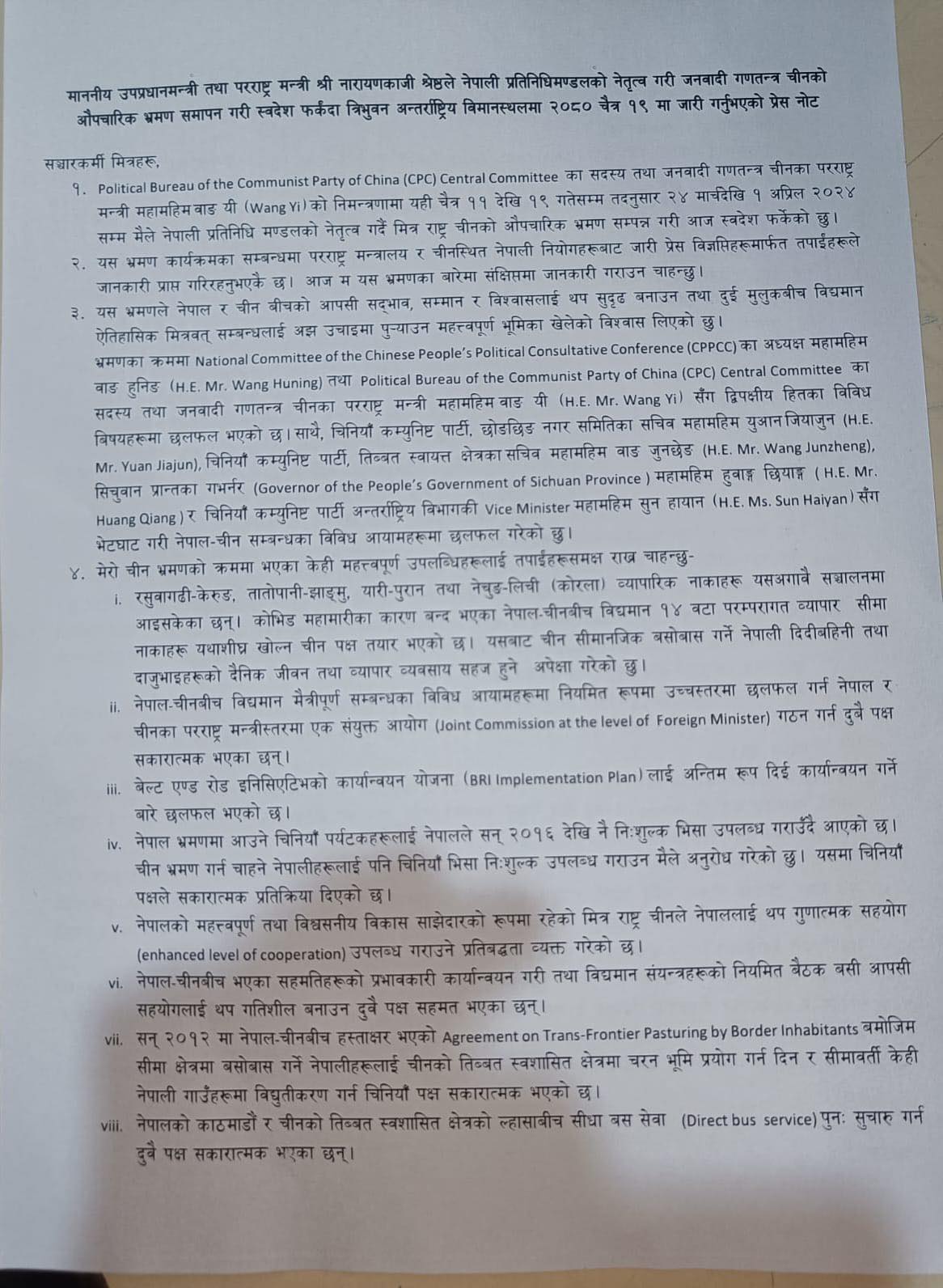 यी हुन् परराष्ट्रमन्त्री श्रेष्ठ चीन भ्रमणको बेला भएका ८ उपलब्धिहरु