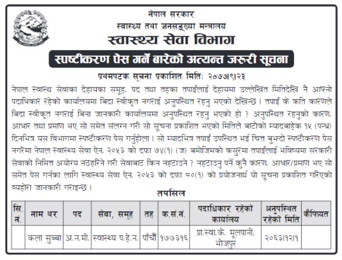 विगत १४ वर्षदेखि बिदा स्वीकृत नगराई कार्यालयमा अनुस्थित रहेको भन्दै विभागले १५ दिनभित्र स्पष्टिकरणसहित उपस्थित हुन निर्देशन दिएको छ । प्राथमिक स्वास्थ्य केन्द्र मूलपानी भोजपुरमा पाँचौं तहमा कार्यरत अनमी कला सुब्बा २०६३ चैत १ गतेबाट कार्यालयमा अनुपस्थित रहेको विभागले जनाएको छ ।