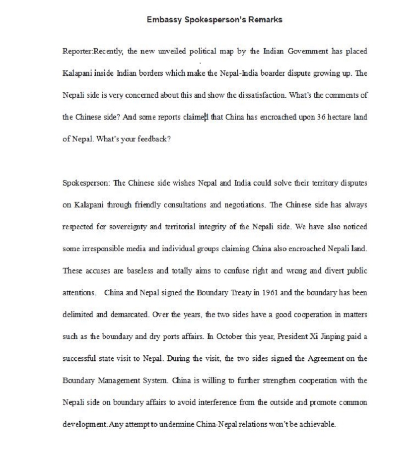 काठमाडौंस्थित चिनियाँ राजदूतावासले बिहीबार साँझ एक विज्ञप्ति जारी गर्दै नेपालको भूभाग अतिक्रमण गरि भारतले आफ्नो नक्सामा गाभेको विषयमा चीनले आफ्नो भनाई सार्वजनिक गर्दै कालापानी क्षेत्रको विवादलाई नेपाल र भारतले वार्ता गरी टुंग्याउनुपर्नेमा जोड दिएको छ ।