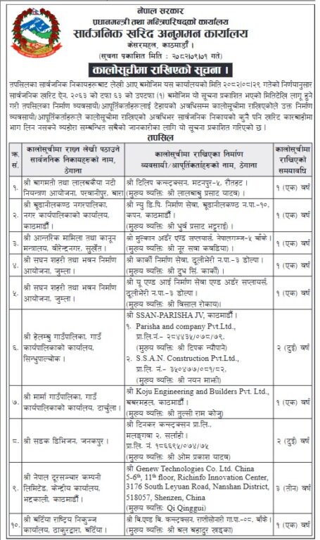 काठमाण्डु– सार्वजनिक खरिद अनुगमन कार्यालयले ११ वटा निर्माण कम्पनीलाई कालो सूचीमा राखेको छ।