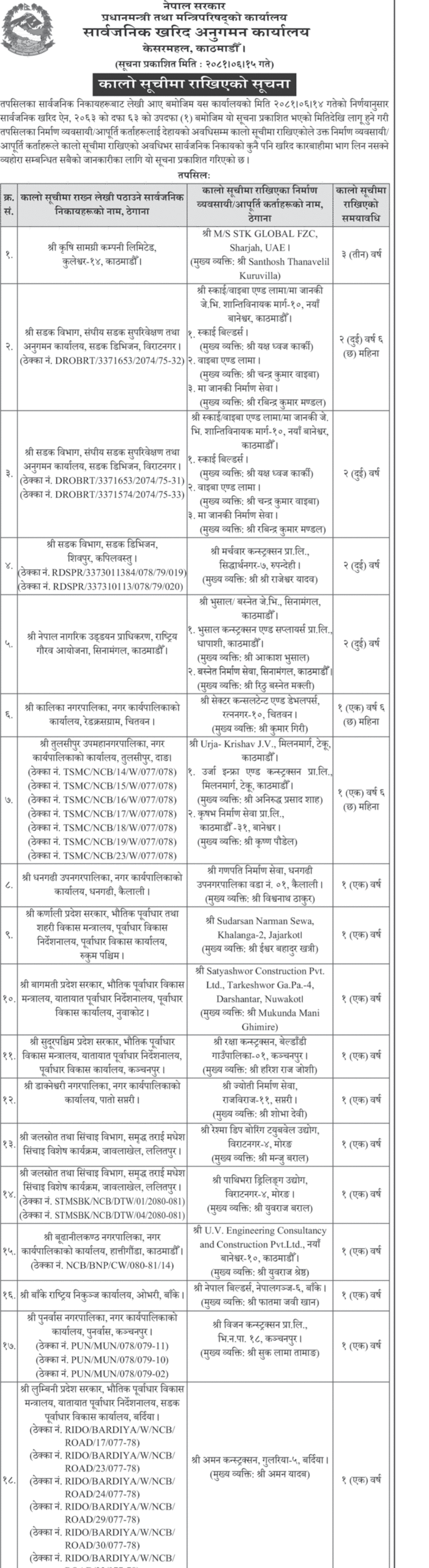 प्रधानमन्त्री तथा मन्त्रिपरिषद् कार्यालयअन्तर्गतको सार्वजनिक खरिद अनुगमन कार्यालयले मंगलबार सूचना जारी गर्दै २३ निर्माण कम्पनीलाई कालो सूचीमा राखिएको जानकारी दिएको हो।