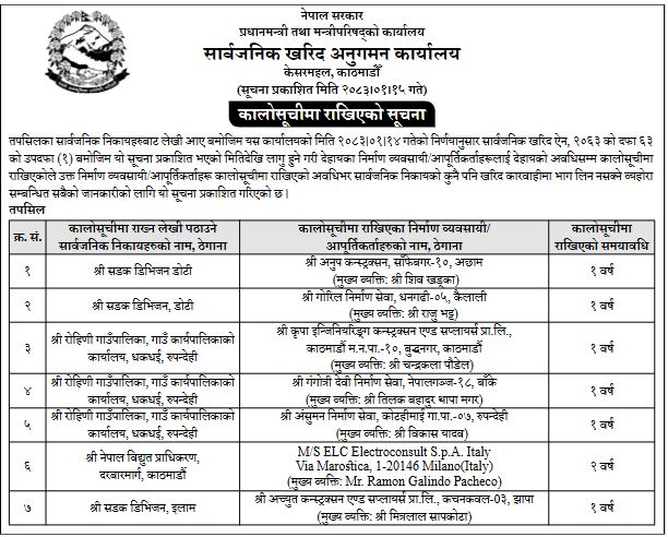कालोसूचीमा पर्नेहरूमा अनुप कन्स्ट्रक्सन, गोरिल निर्माण सेवा, कृपा इन्जिनियरिङ्ग, गंगोत्री देवी निर्माण सेवा, अंसुमन निर्माण सेवा, अच्युत कन्स्ट्रक्सन र नेपाल विद्युत प्राधिकरणको सिफारिसमा इटालीको ‘एम/एस ईएलसी इलेक्ट्रोकन्सल्ट’ रहेका छन् ।