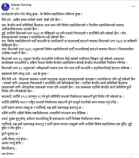 गुरुङले लेखेका छन्, ‘विधानमा व्यवस्था भएको मापदण्ड अनुसार हस्ताक्षरहरूको सनाखत र प्रमाणीकरण पनि भई सकेको छैन । यसको लागि आवश्यक नियमावली र कार्यविधि पनि बनिसकेको छैन । पार्टीको केन्द्रीय कार्य समितिको बैठकमा छलफलको लागि औपचारिक प्रस्तावको रूपमा पनि आएको छैन । यस सम्बन्धमा पार्टीको केन्द्रीय कार्य समितिले कुनै निर्णय पनि गरिसकेको छैन । साथसाथै, पार्टीले २०८२ फाल्गुन २१ गते हुने प्रतिनिधि सभाको निर्वाचनमा सहभागी हुने निर्णय गरि सकेको छ । पार्टीले प्रतिनिधि सभा र राष्ट्रिय सभाको निर्वाचनमा सहभागी हुने सम्पूर्ण तयारीको काम सम्पन्न गर्नु पर्नेछ । पार्टी एकता कायम राख्नु छ र पार्टीलाई अझ बढी एकताबद्ध बनाउनु छ । यसैले पार्टीले अहिले विशेष महाधिवेशनमा अलमलिने सम्भावना कम देखिन्छ ।’