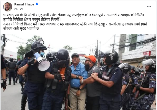 थापाले आफूहरूप्रतिको बर्बरतापूर्ण र अमानवीय व्यवहारका निम्ति प्रधानमन्त्री र गृहमन्त्रीलाई धन्यवाद दिएर कटाक्ष गरेका हुन्। उनले सोमबार सामाजिक सञ्जालमा लेखेका छन्, ‘धन्यवाद प्रम केपी ओली र गृहमन्त्री रमेश लेखकज्यू, तपाईंहरूको बर्बरतापूर्ण र अमानवीय व्यवहारको निम्ति ।’