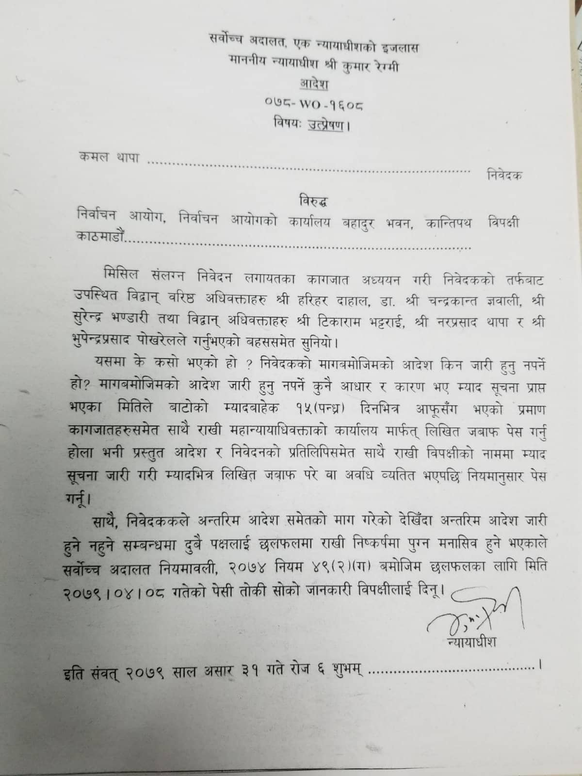 सर्वोच्चका न्यायाधीश कुमार रेग्मीको एकल इजलासले आगामी ८ साउनमा निर्वाचन आयोग र निवेदक राप्रपा नेपालका अध्यक्ष थापालाई छलफलका लागि उपस्थित हुन आदेश गरेको छ ।