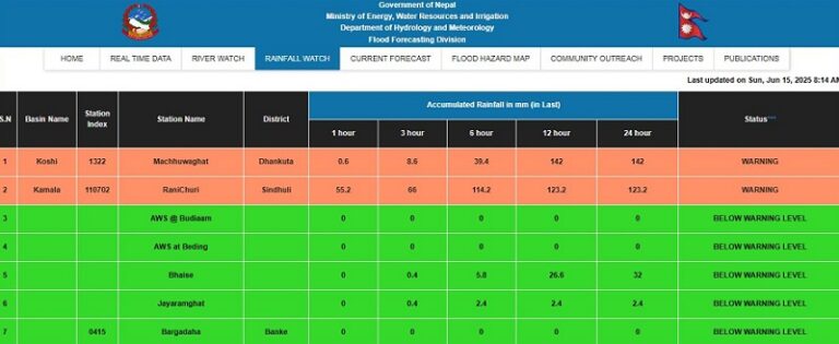 यस्तै देशका अरू केही ठाउँहरुमा मध्यमदेखि ठूलो पानी परिरहेकोले खोला तथा नदी तटीय क्षेत्रमा सतर्कता अपनाउन बाढी पूर्वानुमान महाशाखाले आग्रह गरेको छ ।