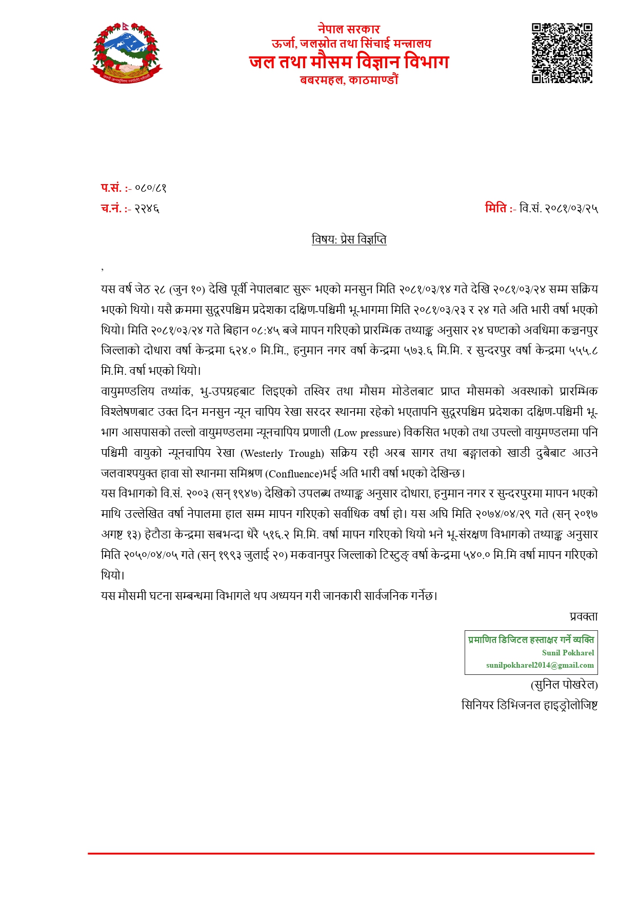 अगाडि भनिएको छ, ‘मापन भएको माथि उल्लेखित वर्षा नेपालमा हालसम्म मापन गरिएको सर्वाधिक वर्षा हो । यसअघि मिति २०७४/०४/२९ गते (सन् २०१७ अगस्ट १३) हेटौंडा केन्द्रमा सबभन्दा धेरै ५१६.२ मि.मि. वर्षा मापन गरिएको थियो भने भूसंरक्षण विभागको तथ्यांकअनुसार मिति २०५०/०४/०५ गते (सन् १९९३ जुलाई २०) मकवानपुर जिल्लाको टिस्टुङ वर्षा केन्द्रमा ५४०.० मि.मि. वर्षा मापन गरिएको थियो ।’