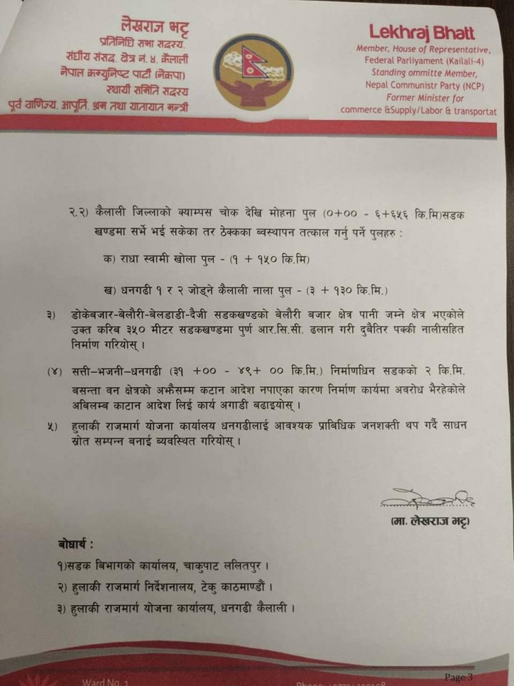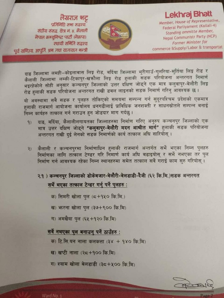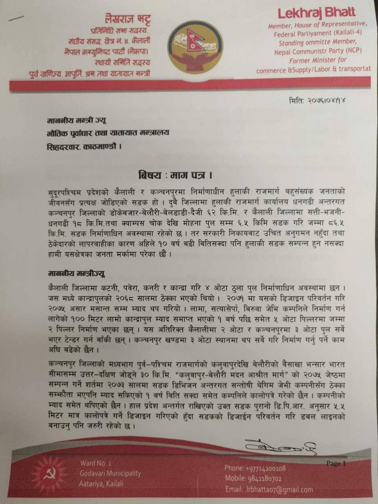 काठमाडौं – नेकपाका स्थायी समिती सदस्य लेखराज भट्टले कलुवापुर बेलौरी सडक खण्डलाई हुलाकी सडक परियोजना अन्तर्गत राख्न माग गरेका छन् ।