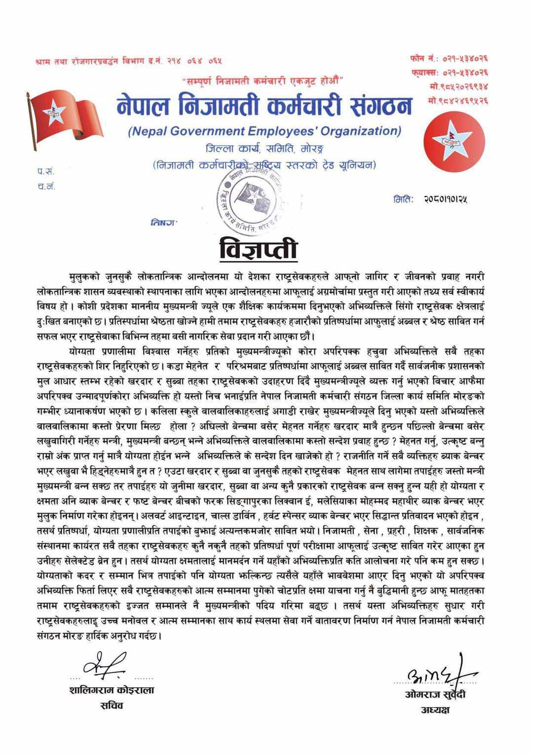 ‘प्रतिस्पर्धामा श्रेष्ठता खोज्ने हामी तमाम राष्ट्रसेवकहरू हजारौँको प्रतिस्पर्धामा आफूलाई अब्बल र श्रेष्ठ साबित गर्न सफल भएर राष्ट्र सेवाका विभिन्न तहमा बसी नागरिकको सेवा प्रदान गरी आएका छौँ, विज्ञप्तिमा भनिएको छ, योग्यता प्रणालीमा विश्वास गर्नेहरू प्रतिको मुख्यमन्त्रीज्यूको कोरा अपरिपक्व हचुवा अभिव्यक्तिले सबै तहका राष्ट्रसेवकहरूको शिर निहुरिएको छ ।’