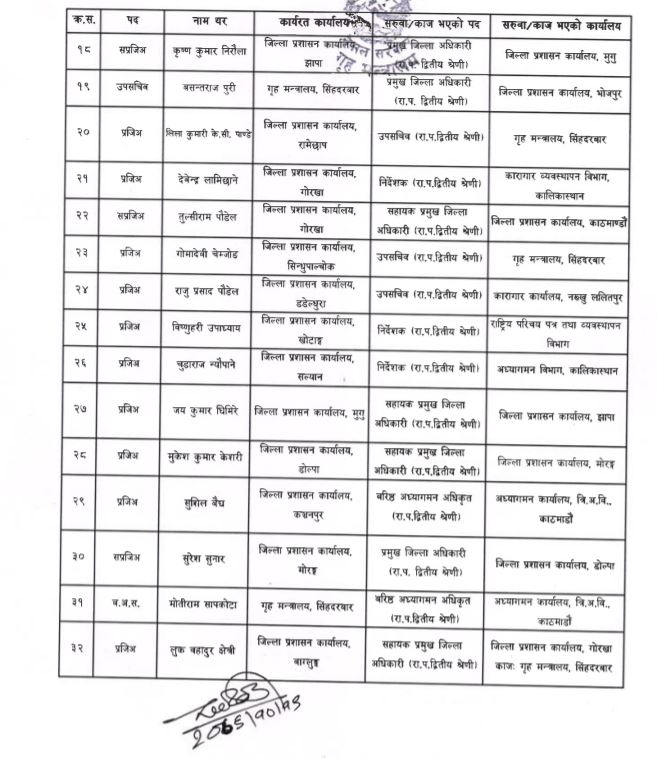 काठमाडौं – गृह मन्त्रालयले १७ जना सहसचिव र १५ उपसचिवसहित ३२ जना कर्मचारीको सरुवा गरेको छ ।