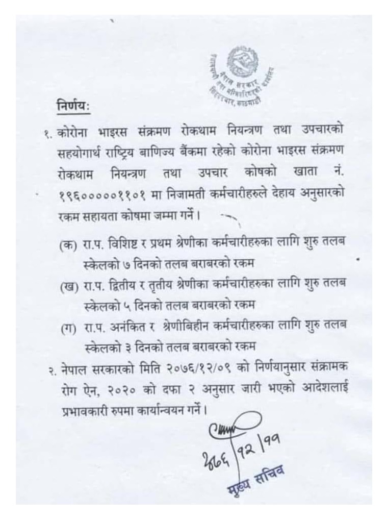 राजपत्रांकित विशिष्ठ र प्रथम श्रेणी (मुख्यसचिव, सचिव र सहसचिव)को हकमा शुरू तलबको ७ दिनको तलब, राजपत्रांकित द्वितीय र तृतीय श्रेणीका कर्मचारीको ५ दिनको तलब तथा राजपत्र अंकित र श्रेणीबिहीन कर्मचारी शुरू तलबको ३ दिनको तलब कोषमा जम्मा गर्ने मुख्यसचिव लोकदर्शन रेग्मीले हस्ताक्षर गरेको निर्णयमा उल्लेख छ ।