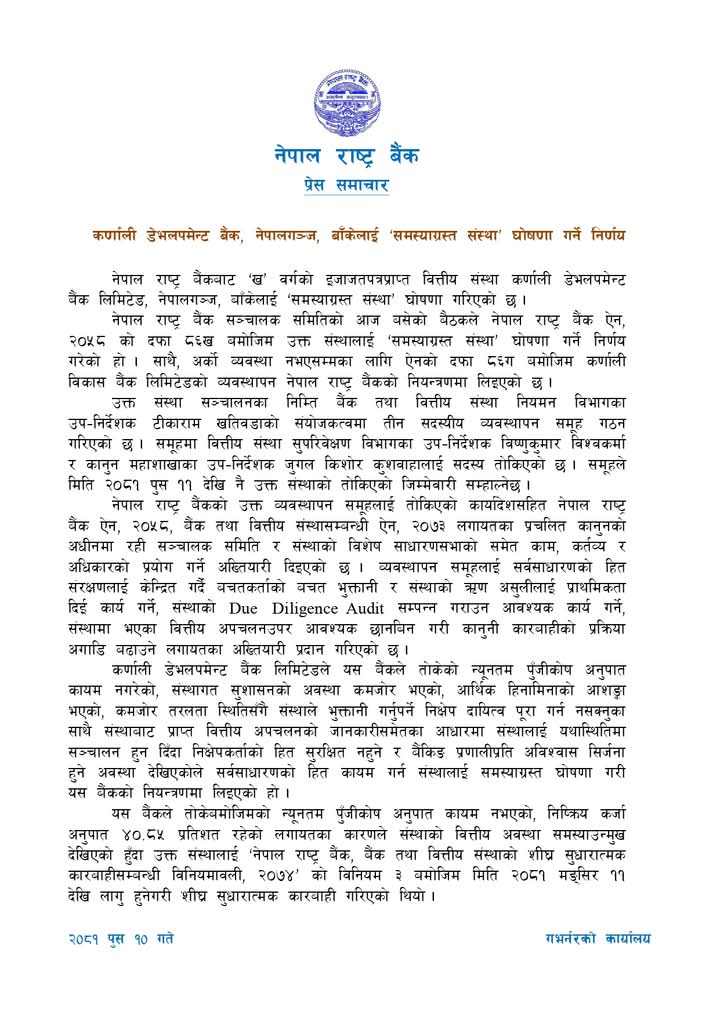 अर्को व्यवस्था नभएसम्मका लागि ऐनको दफा ८६ग बमोजिम कर्णाली विकास बैंक लिमिटेडको व्यवस्थापन राष्ट्र बैंकले नियन्त्रणमा लिएको छ ।