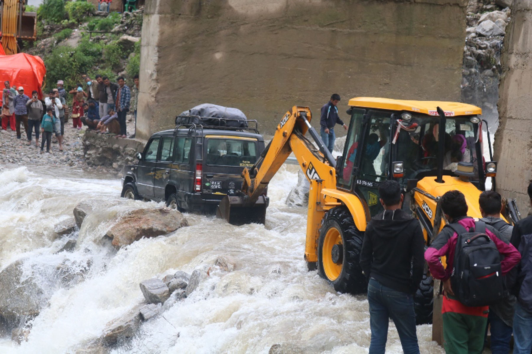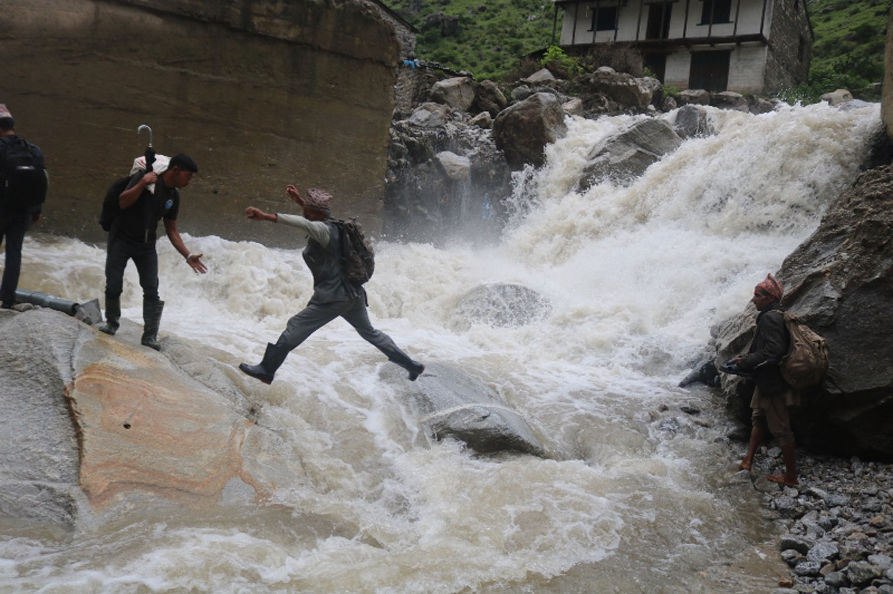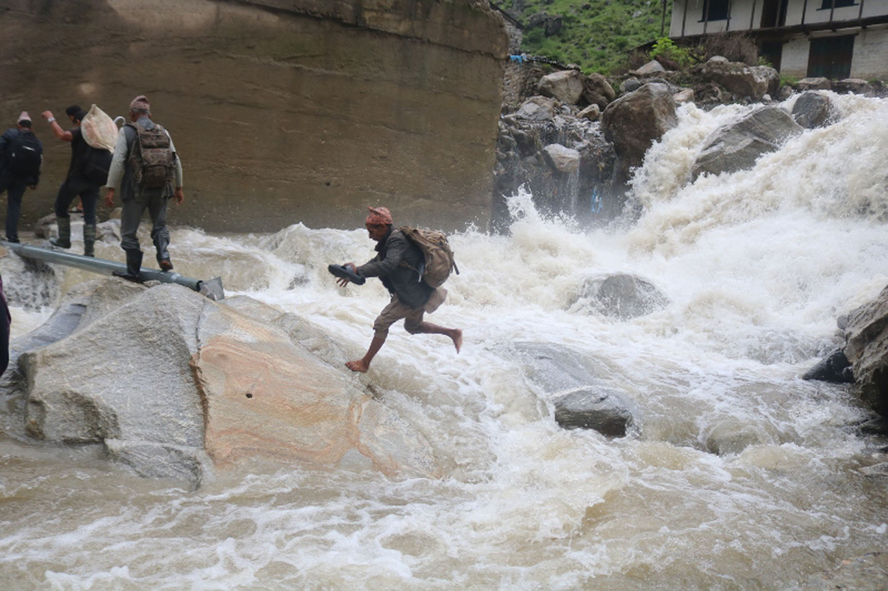 यस्तै कर्णाली राजमार्गको कालीकोट खण्डमा पर्ने तिलागुफा नगरपालिका–८ टाकुल्ला खोलामा पुल नहुँदा खोलामा आएको बाढीमा हाम्फालेर जोखिमपूर्ण यात्रा गर्न त्यहाँका स्थानीय बाध्य छन् ।