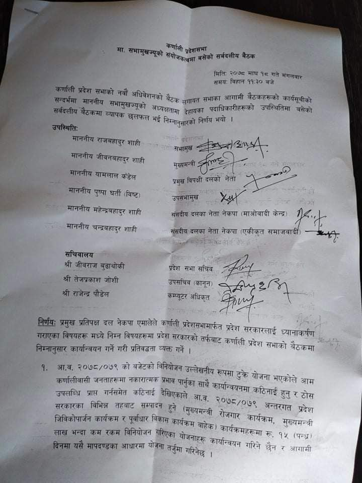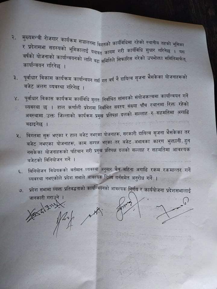 काठमाण्डु – संसदको जारी गतिरोध खेुलाउन कर्णाली प्रदेशमा सरकार र प्रमुख प्रतिपक्ष दलबीच ७ बुँदे सहमति भएको छ । मंगलबार सभामुख राजबहादुर शाहीको संयोजकत्वमा बसेको सर्वदलीय बैठकले एमालेले सरकारसमक्ष राखेको विभिन्न माग पूरा गर्ने निर्णय गरेपछि सरकार र एमालेबीच ७ बुँदे लिखित सहमति भएको हो ।