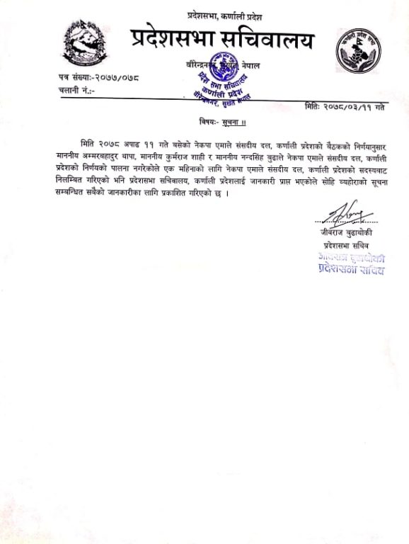 ‘नेकपा एमाले संसदीय दल कर्णाली प्रदेशको वैठकको निर्णयअनुसार नेकपा एमाले संसदीय दल कर्णाली प्रदेशको निर्णयको पालना नगरेकोले एक महिनाका लागि नेकपा एमाले संसदीय दल कर्णाली प्रदेशको संसदबाट निलम्वित गरिएको भनि प्रदेश सभा सचिवालय कर्णाली प्रदेशलाई जानकारी प्राप्त भएकोले सोही व्यहोरोको सूचना सम्वन्धित सबैको जानकारीका लागि प्रकाशित गरिएको छ,’ जारी विज्ञप्तिमा भनिएको छ ।