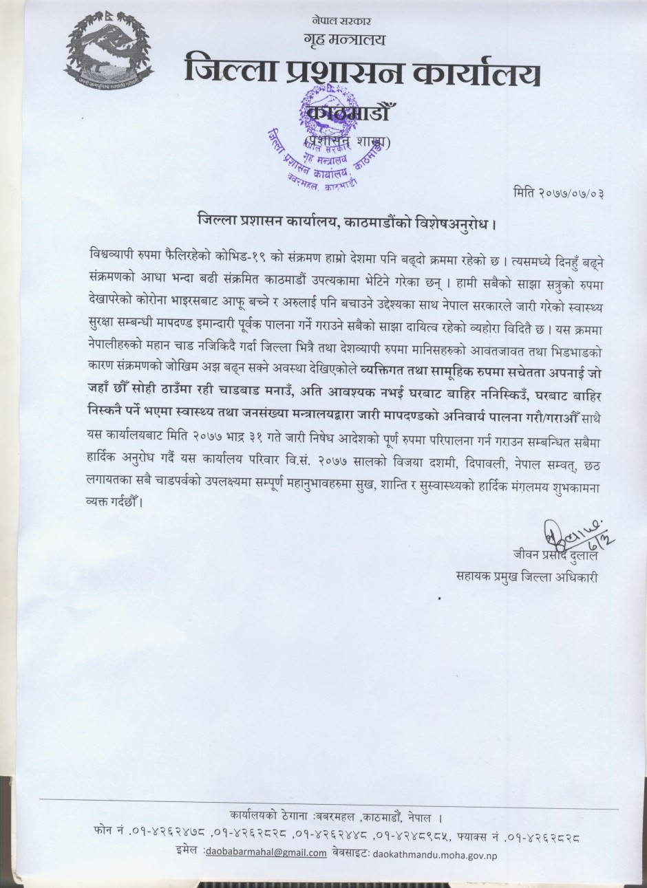 ‘चाडबाड नजिँदै गर्दा जिल्ला भित्रै तथा देशव्यापी रुपमा मानिसहरुको आवतजावत तथा भिडभाडका कारण संक्रमणको जोखिम अझ बढ्न सक्ने अवस्था देखिएकाले व्यक्तिगत तथा सामूहिक रुपमा सचेतता अपनाई जो जुन ठाउँमा रही चाडपर्व मनाउँ, अति आवश्यक नभई घरबाट बाहिर ननिस्किउँ’, विज्ञप्तिमा भनिएको छ ।