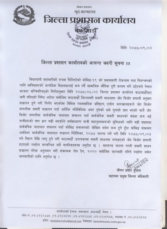 ‘जोर विजोर प्रणलीअनुसार सञ्चालन हुने गरी निर्णय भएकोमा विभिन्न व्यावसायिक प्रतिष्ठान, उद्योग कारखानाहरुले जोर विजोर प्रणलीमा सवारी सञ्चालन गर्दा आर्थिक गतिविधिमा असर पुगेको भन्ने गुनासो प्राप्त भएको साथै जोर विजोर प्रणलीमा सार्वजनिक सवारी यातायात सञ्चालन गर्दा सार्वजनिक सवारी साधनको संख्या कम भई यात्रीहरुको चाप बढी भएकाले सर्वसाधारण यात्रीहरुको सुविधाका बढी संख्यामा सार्वजनिक यातायात सञ्चालन गर्दा कोभिड संक्रमण जोखिमसमेत कम हुने हुँदा कोभिड संक्रमण अवधिभर सार्वजनिक सञ्चालन निर्देशिका २०७७ पालना गर्ने गरी पुस ३ गतेबाट काठमाण्डु उपत्यकामा सवारी साधनमा लगाइएको जोर विजोर प्रणाली हटाएको व्यहोरा सबै नागरिकहरुमा अनुरोध छ’, काठमाण्डुका सहायक प्रमुख जिल्ला अधिकारी जिवन प्रसाद दुलालद्वारा जारी विज्ञप्तिमा भनिएको छ ।
