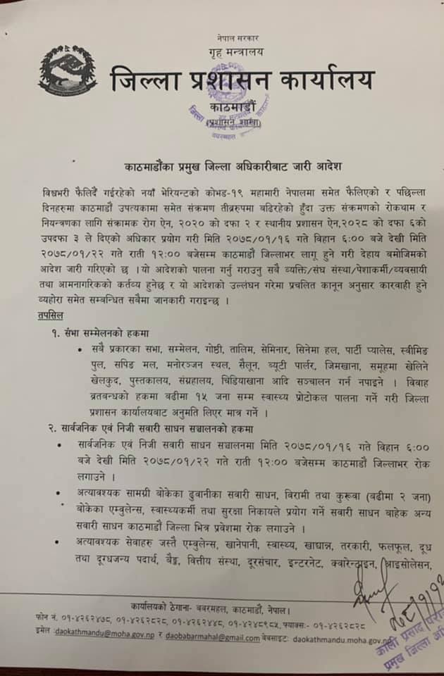 काठमाण्डु, भक्तपुर र ललितपुरका जिल्ला प्रशासन कार्यालयले वैशाख १६ गते विहान ६ बजेदेखि वैशाख २२ गते मध्यराति १२ बजेसम्मका लागि निषेधाज्ञा जारी गरेका हुन् ।