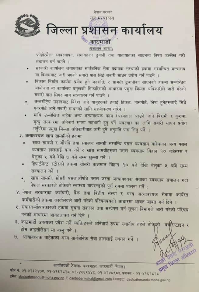 नेपाल सरकारका कर्मचारी, बैंक, अत्यावश्यक क्षेत्रमा काम गर्ने कर्मचारी, सञ्चारकर्मीहरुलाई परिचयपत्रका आधारमा आवतजावत गर्न दिने बताइएको छ । काठमाण्डु उपत्यकामा प्रवेश गर्ने सबैले अनिवार्य क्वारेन्टाइनमा बस्नुपर्ने नियम पनि ल्याइएको छ ।