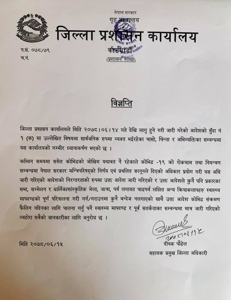 शुक्रबार सहायक प्रमुख जिल्ला अधिकारी दीपक पौडेलले हिजोको आदेशको बुँदा नम्बर १ लाई लिएर सार्वजनिक रुपमा जारी भइरहेका अभिव्यक्तिबारे ध्यानाकर्षण भएको उल्लेख गरेका छन् ।
