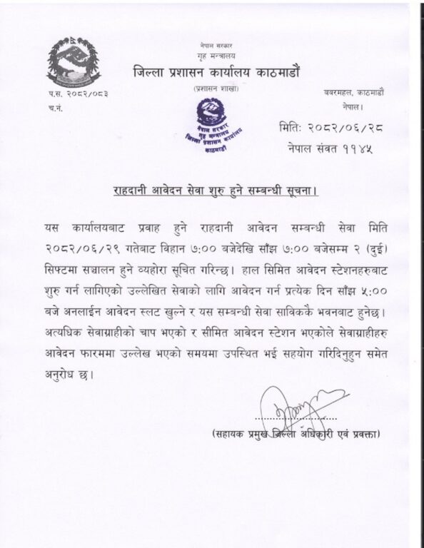 सीमित आवेदन स्टेशनबाट सुरु गर्न लागिएको सो सेवाका लागि आवेदन गर्न साँझ ५ बजे अनलाइन स्लट खुल्नेछ।