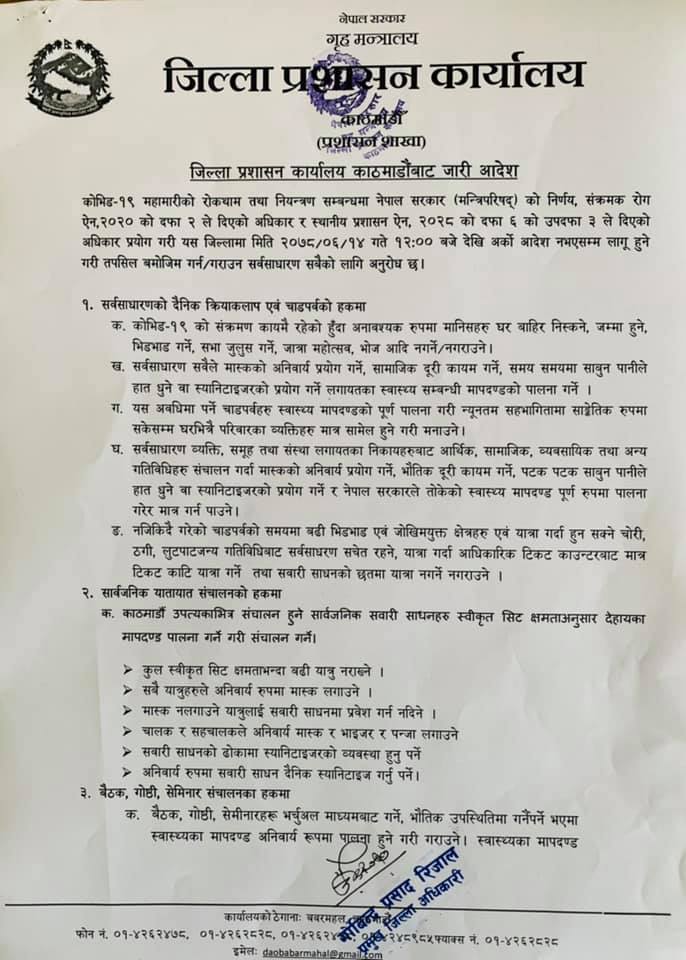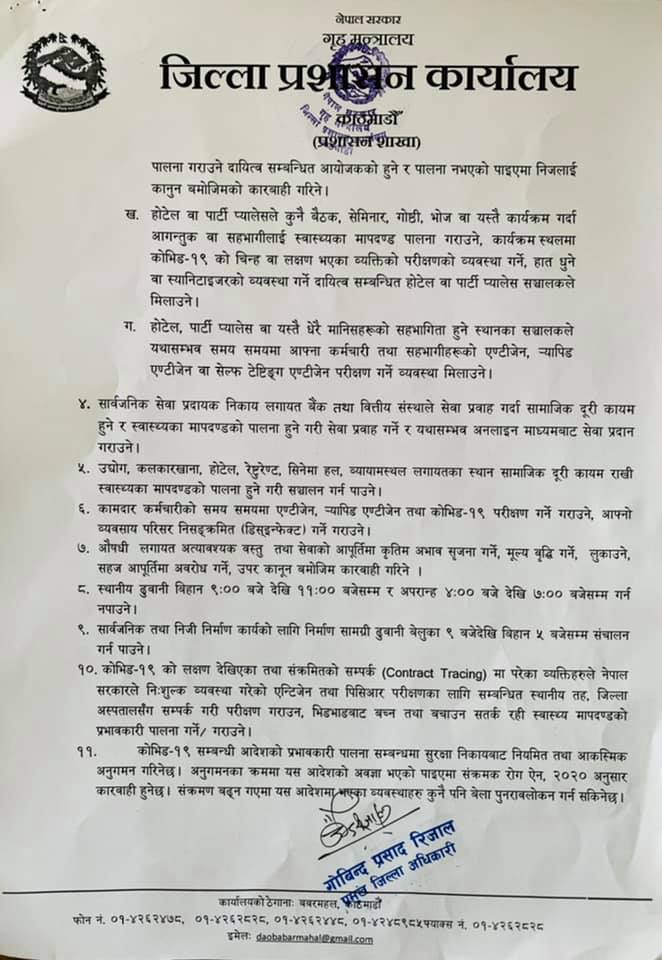 कोभिड–१९ संक्रमण कायम रहेको भन्दै प्रशासनले न्यूनतम सहभागितामा र सांकेतिकरुपमा चाडपर्व मनाउन आदेश जारी गरेको छ ।