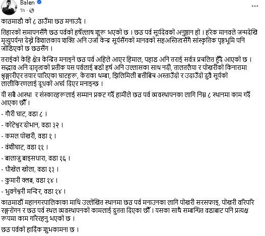 महानगर क्षेत्रभित्र ८ स्थानमा छठ पर्व मनाउने व्यवस्था मिलाइएको मेयर बालेन्द्र शाहले जानकारी दिएका छन् । उनका अनुसार छठ पर्व व्यवस्थापनका लागि महानगरपालिकाले ८ स्थानमा काम गरिरहेको छ ।