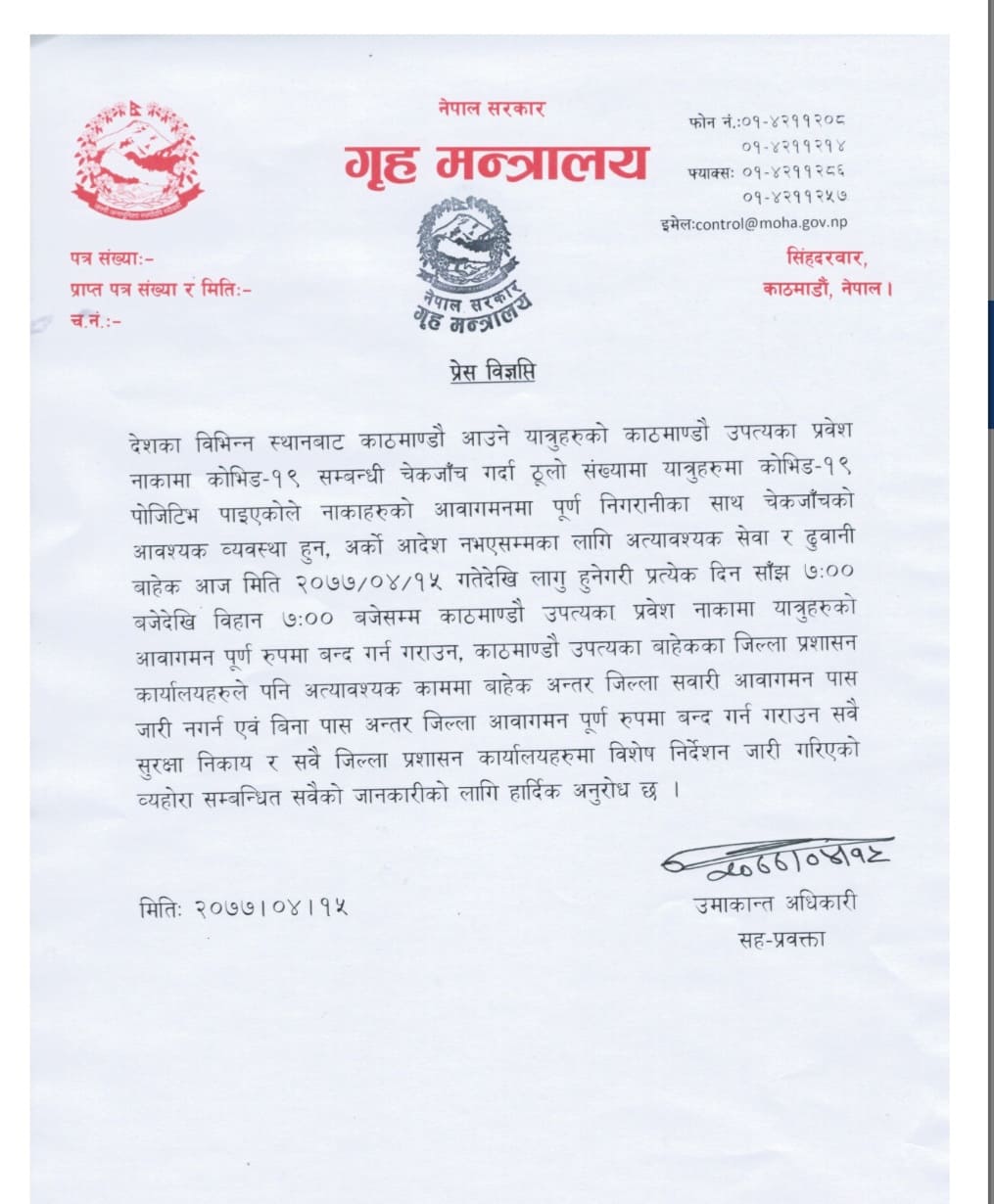 अब काठमाण्डु उपत्यकामा साँझ ७ बजेदेखि विहान ७ बजेसम्म आवागमनमा रोक लगाएको हो ।