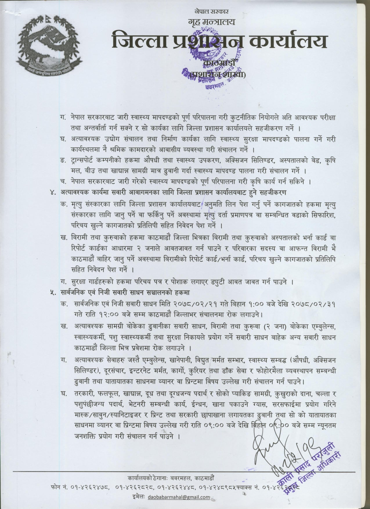ढुवानीका सवारी साधन, बिरामी तथा कुरुवा (२ जना) बोकेका एम्बुलेन्स, स्वास्थ्यकर्मी, पशु स्वास्थ्यकर्मी तथा सुरक्षा निकायले प्रयोग गर्ने सवारी साधन बाहेक अन्य सवारी साधन प्रवेशमा रोक लगाइएको छ ।