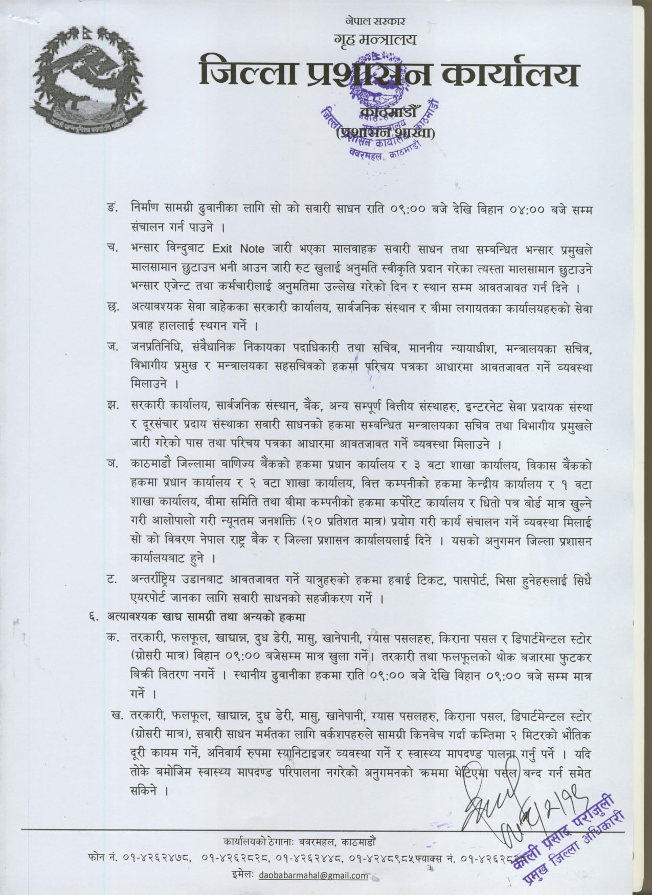 त्यस्तै अत्यावश्यक सेवा बाहेकका सरकारी कार्यालय, सार्वजनिक संस्थान र बीमा लगायतका कार्यालयहरुको सेवा प्रवाह हाललाई स्थगन गर्ने निर्णय पनि भएको छ ।