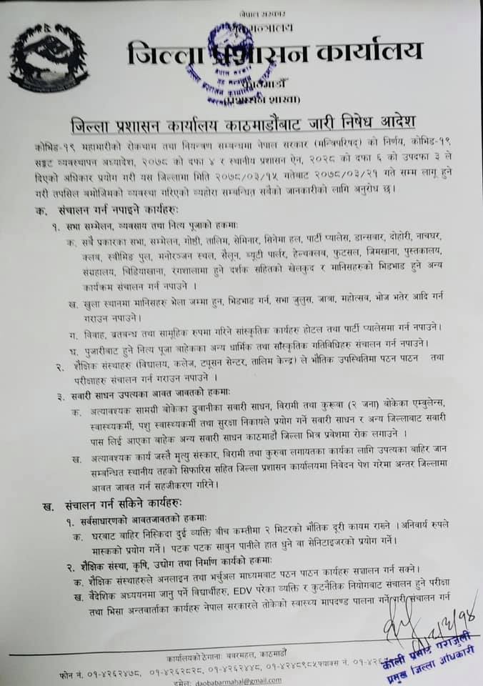 यस्तै सभा सम्मेलन तथा नित्य पूजा गर्न बन्देज लगाइएको छ । सैलुन, व्यूटी पार्लर, फुटसल, जिमखाना, शैक्षिक संस्थाहरु पनि खोल्न दिइएको छैन् । ट्युसन सेन्टर, तालिम केन्द्र, कलेज विद्यालय भौतिक उपस्थितिमा सञ्चालन गर्न नपाइने भएको हो ।