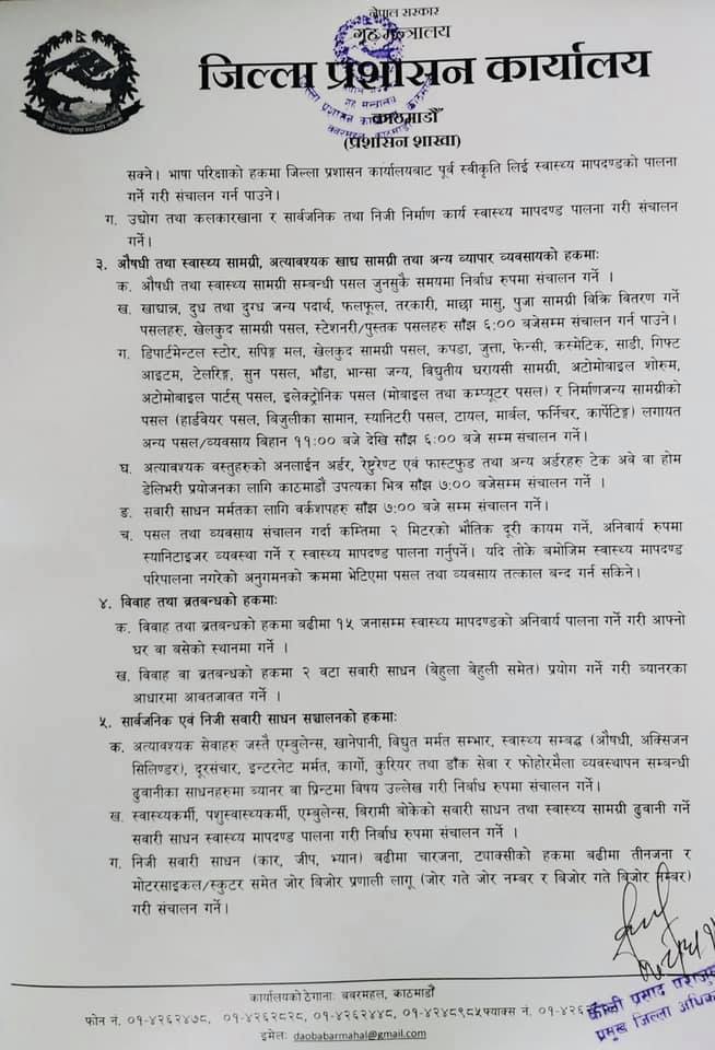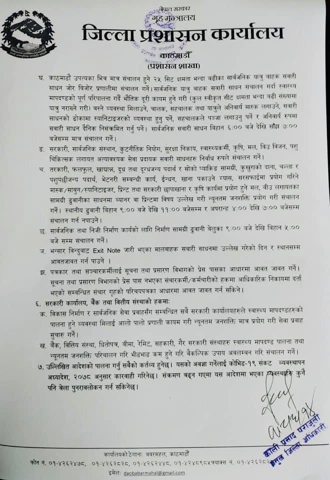 सोमबार काठमाण्डु, ललितपुर र भक्तपुरका प्रमुख जिल्ला अधिकारीहरुको बैठकले मंगलबारबाट लागू हुनेगरी सार्वजनिक यातायातसहित पसलहरु सञ्चालन गर्न दिने निर्णय गरेको हो ।