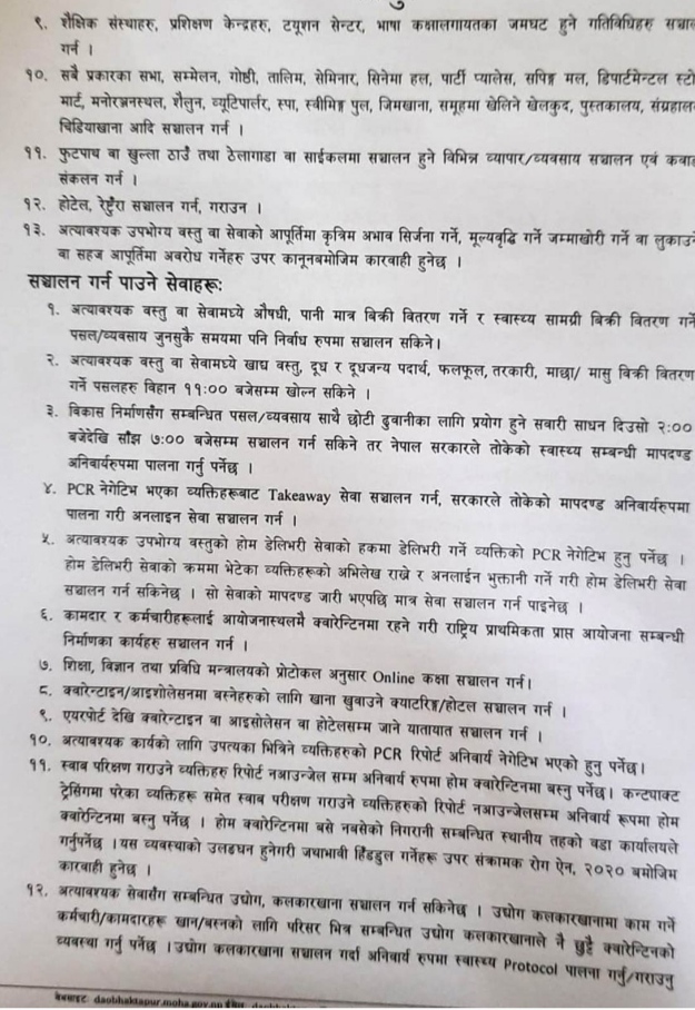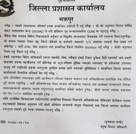 काठमाण्डु – काठमाण्डु उपत्यकामा एक हप्ता निषेधाज्ञा थप गरिएको छ । काठमाण्डु, ललितपुर र भक्तपुरका प्रमुख जिल्ला अधिकारीहरुको बैठकले भदौ २४ गतेसम्मका लागि लकडाउन थप गर्ने निर्णय भएको हो ।