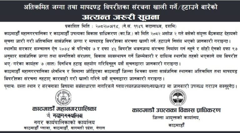 काठमाण्डु – काठमाण्डु महानगरपालिका र काठमाण्डु उपत्यका विकास प्राधिकरणले अतिक्रमित जग्गा तथा मापदण्ड विपरीतका संरचना हटाउन सात दिने अल्टिमेटम जारी गरेका छन्।