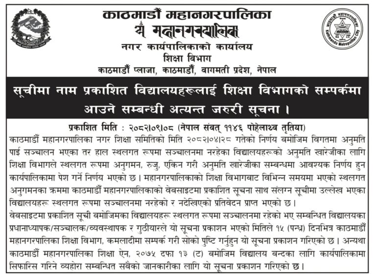 काठमाण्डु महानगरले यी १०७ विद्यालय खारेज गर्ने, निकाल्यो सूचना