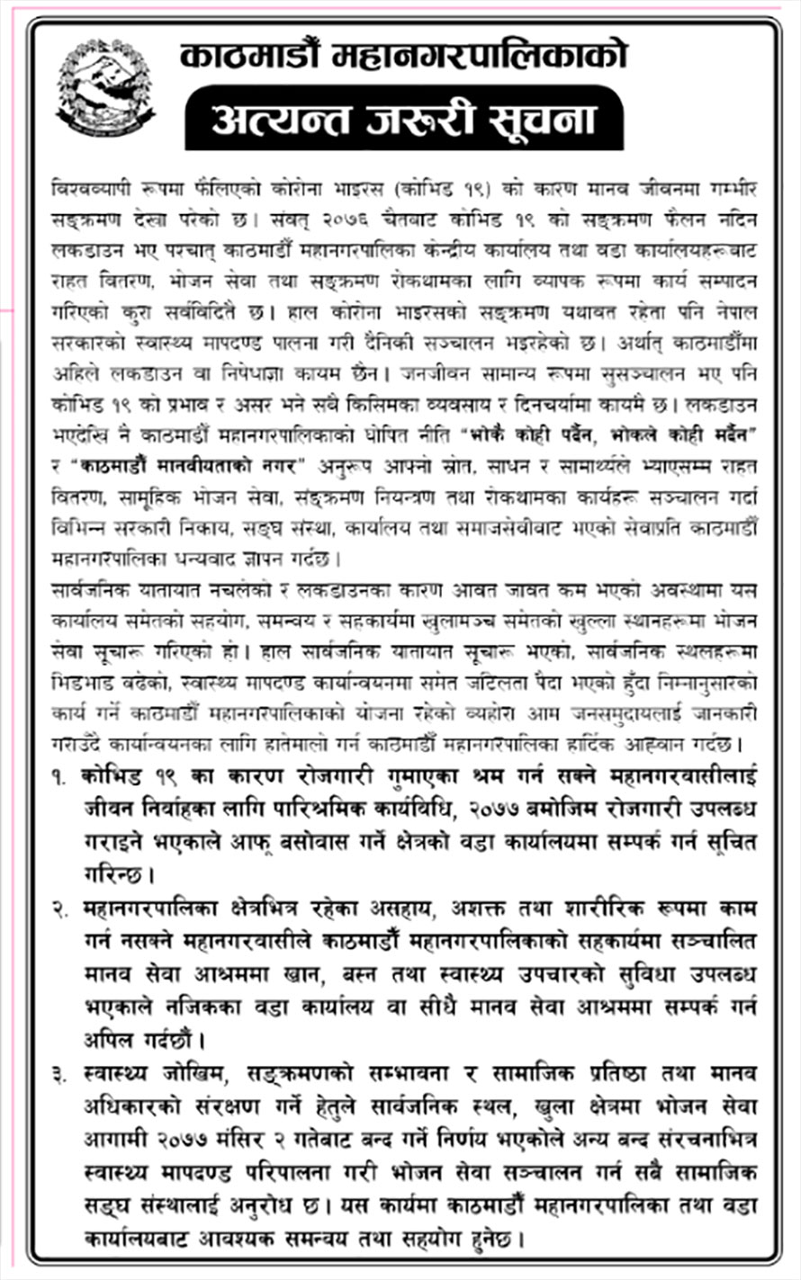 काठमाण्डु – काठमाण्डु महानगरपालिकाले कोरोना भाइरसको संक्रमणका रोजगारी गुमाएकाहरुलाई वडा कार्यालयमा सम्पर्क गर्न आग्रह गरेको छ ।