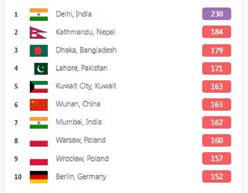 पहिलो स्थानमा भारतको दिल्ली छ । दिल्लीको सूचकांक २३० छ । त्यस्तै तेस्रोमा बंलादेशको ढाका छ भने चौथो स्थानमा पाकिस्तानको लाहोर र कुवेत छन् ।